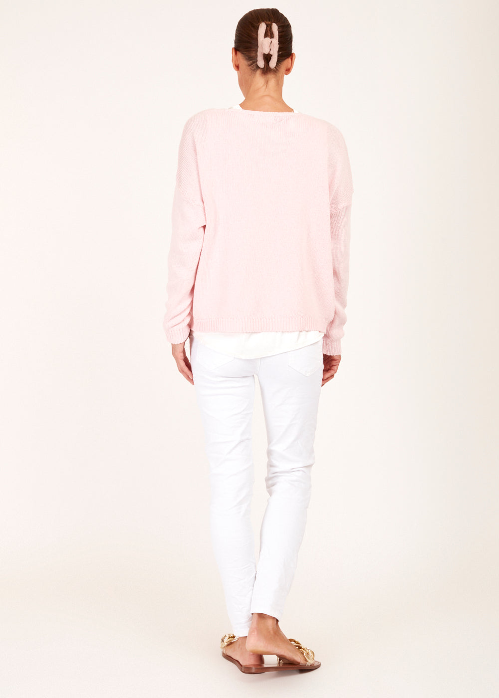 Erlebe den Komfort und die Eleganz des Rundsaum Pullovers in der Traumfarbe rosa - ein absolutes Must-Have für alle, die Stil und Gemütlichkeit lieben."