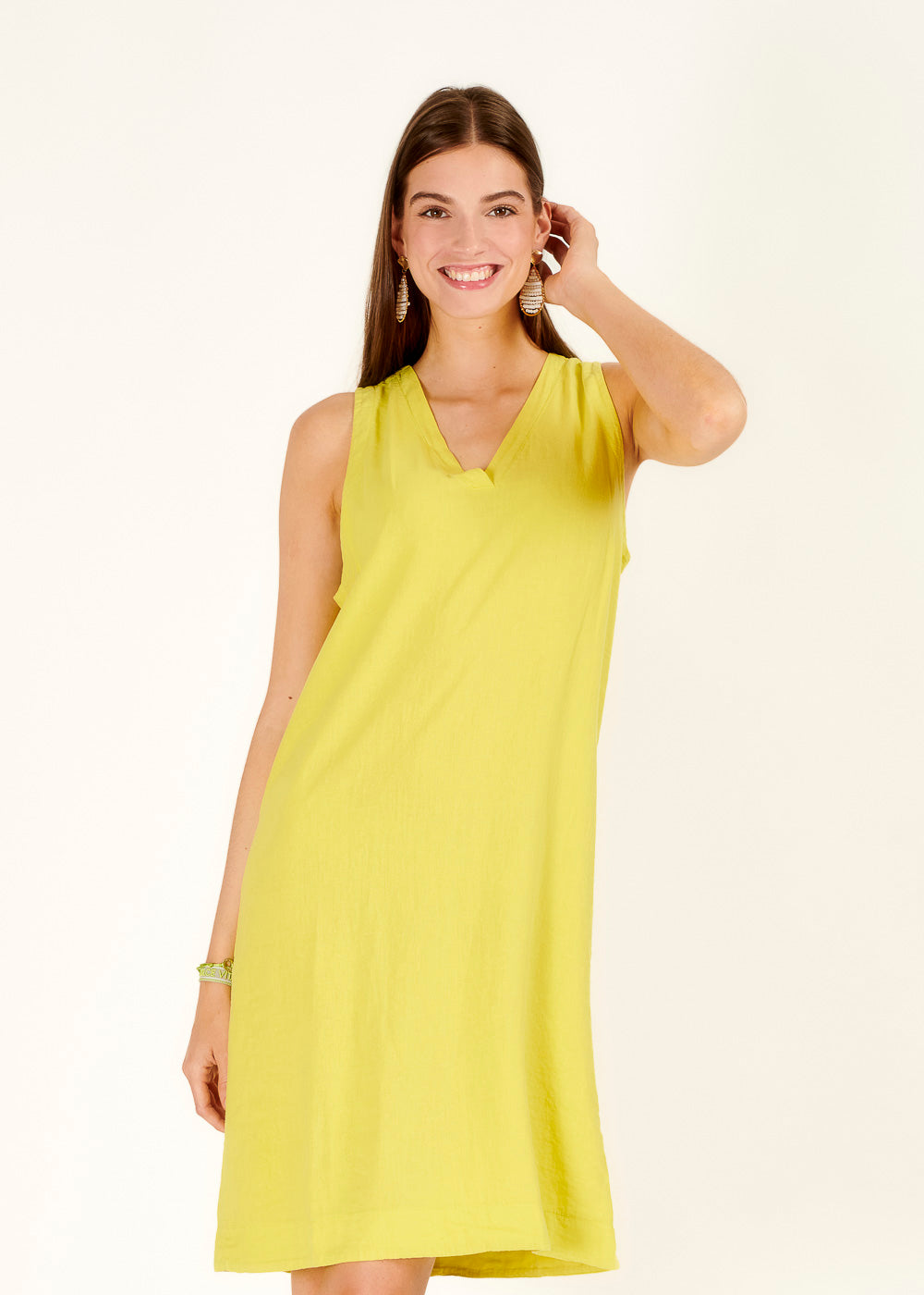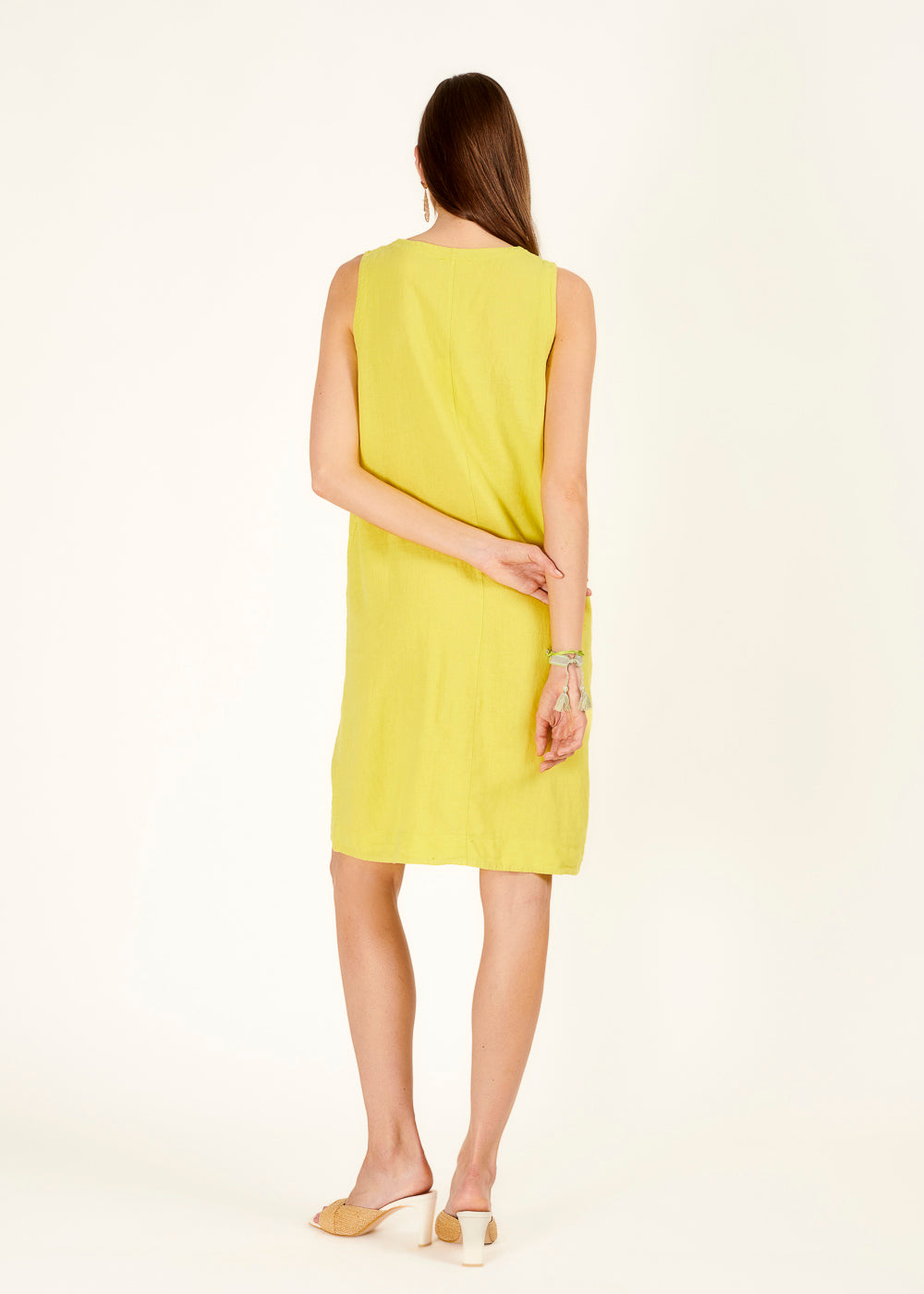 Unser Leinenkleid in strahlendem Zitronengelb vereint sommerliche Frische mit stilvoller Eleganz. Leicht und luftig, perfekt für heiße Tage und angenehme Nächte, lässt es Sie überall erstrahlen.