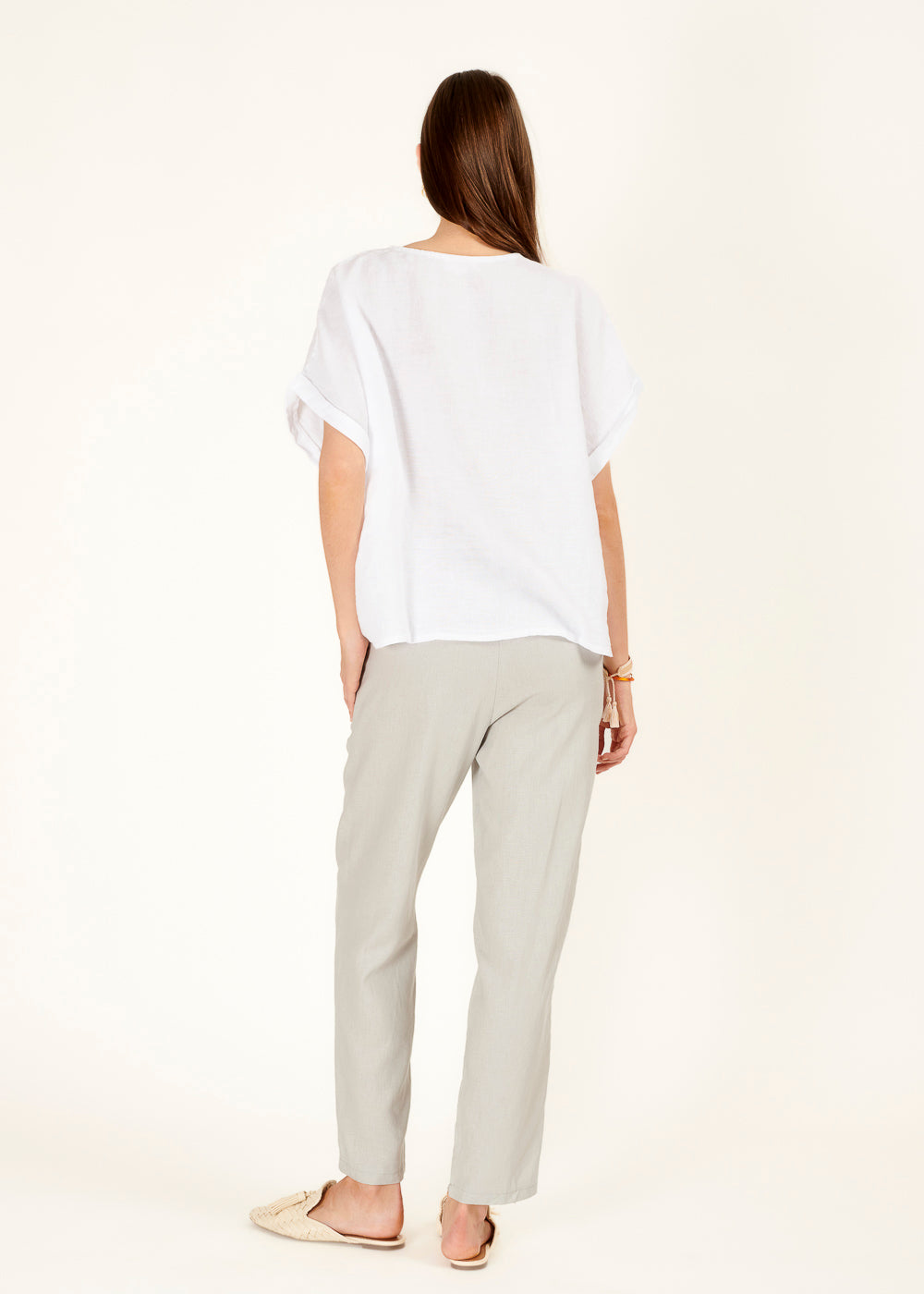 Unsere Leinentunika in Bianco-Ottico besticht durch ihre luftige Leichtigkeit und zeitlose Eleganz. Ideal für sommerliche Tage und stilvolle Auftritte.