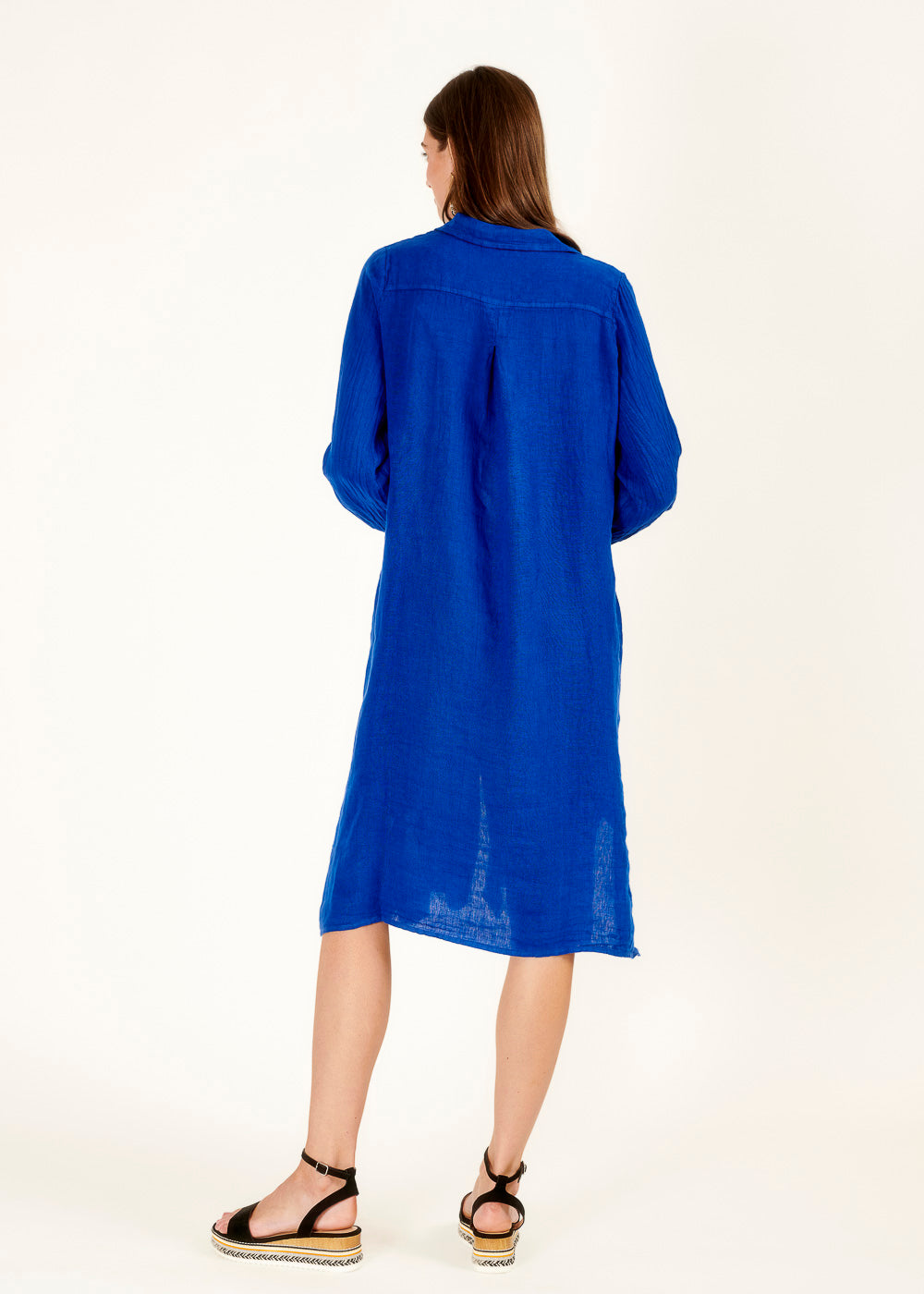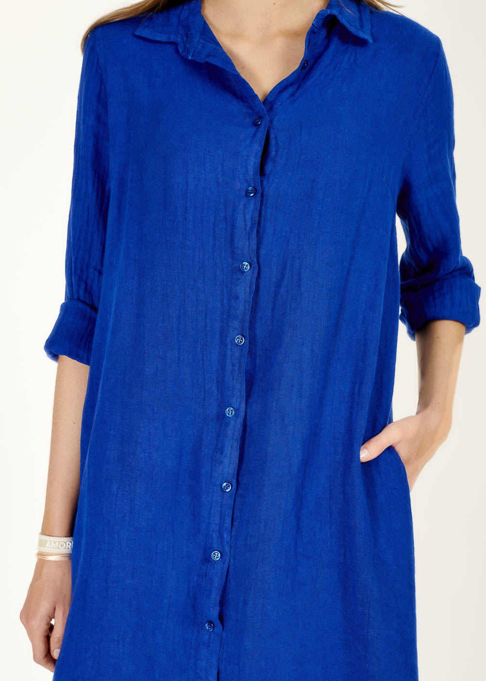 Erlebe den eleganten Komfort des Leinenhemdblusenkleids in royal. Perfekt für warme Tage, verleiht es deinem Look eine mühelose Raffinesse.