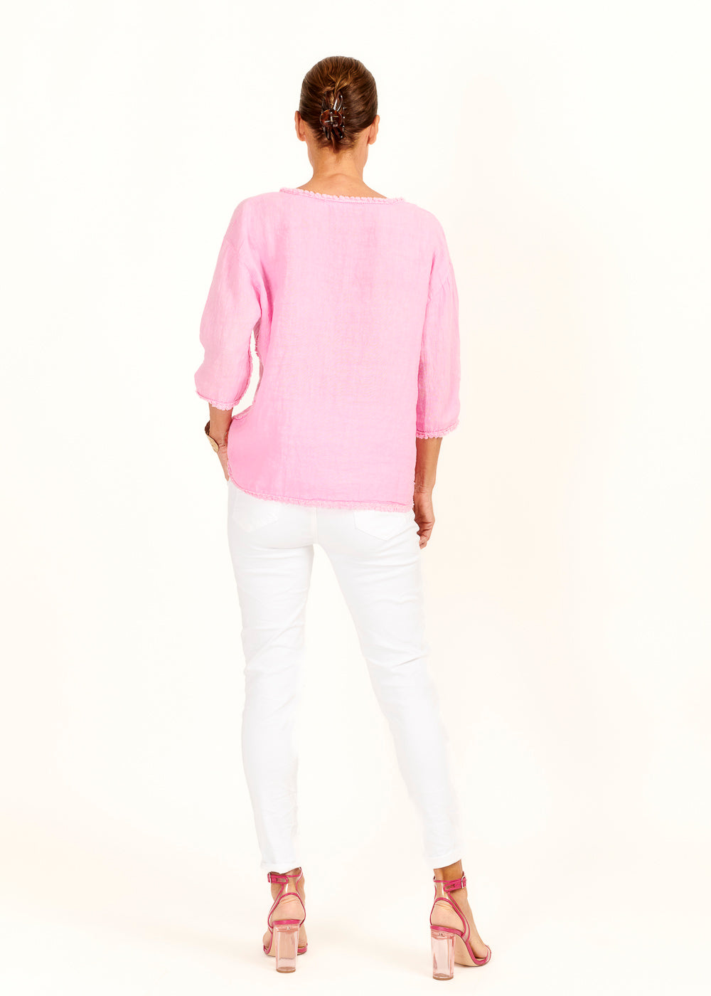 Entdecke unsere luftige Leinentunika mit Fransen in Rosa – perfekt für einen entspannten und stilvollen Sommerlook.