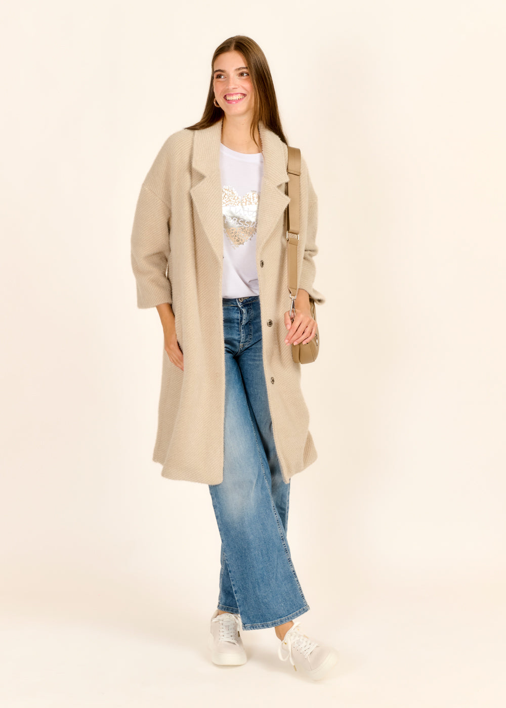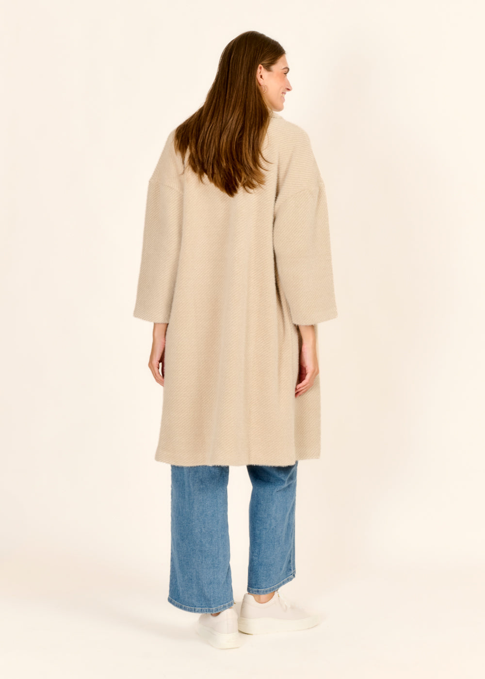 Erlebe den perfekten Mix aus Komfort und Stil mit unserem lang geschnittenen Mantel in elegantem Beige. Dieser Mantel punktet mit seinem zeitlosen Schnitt, hochwertigem Strickmaterial, schlichten Knöpfen und praktischen Taschen.