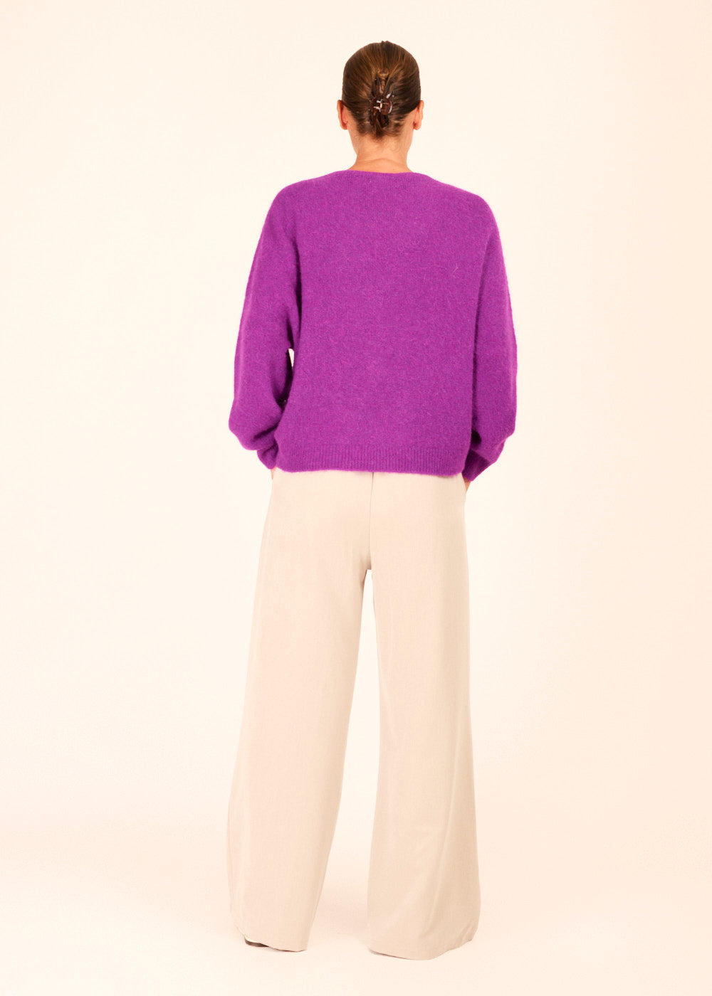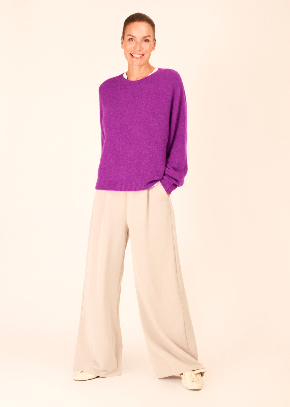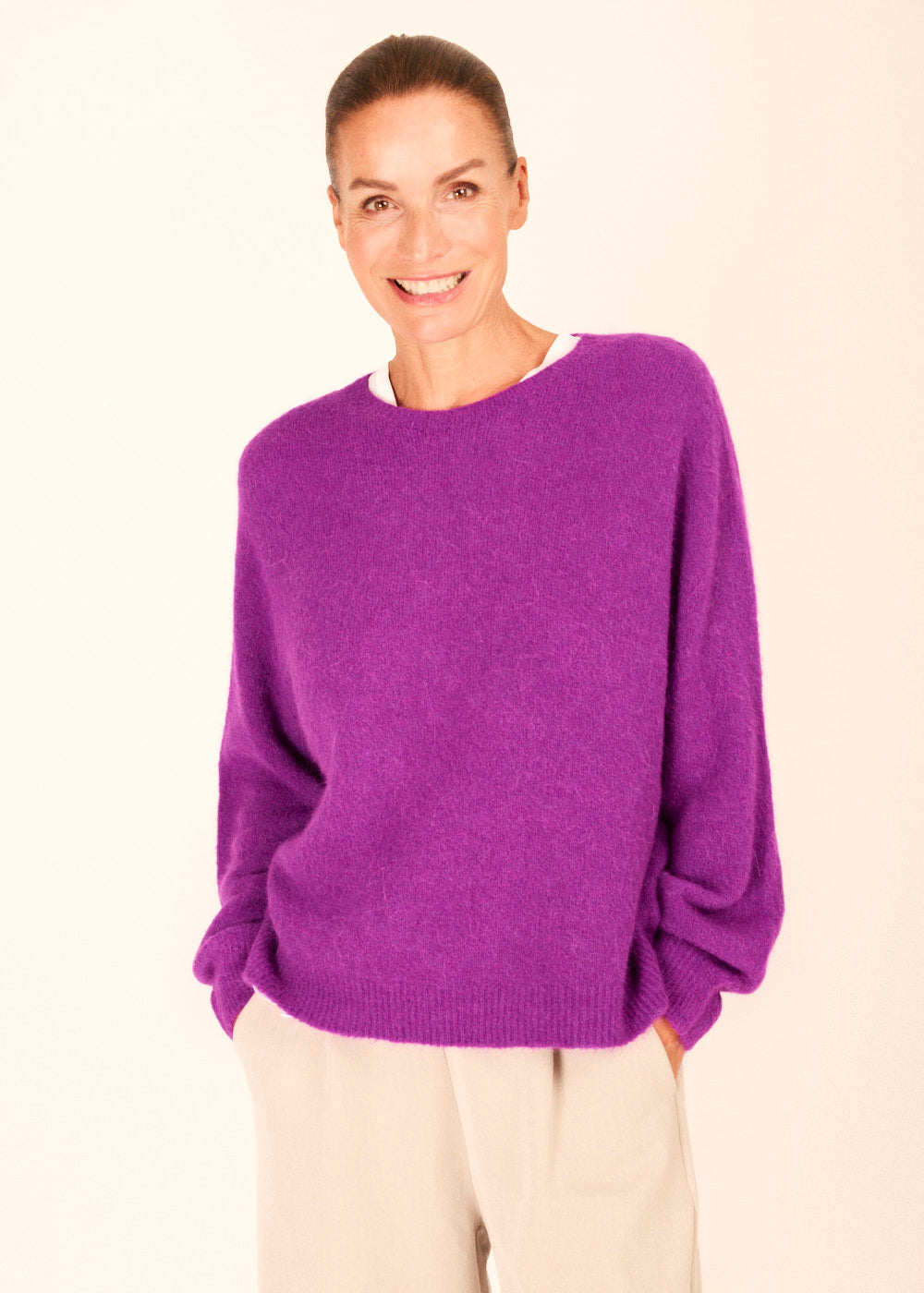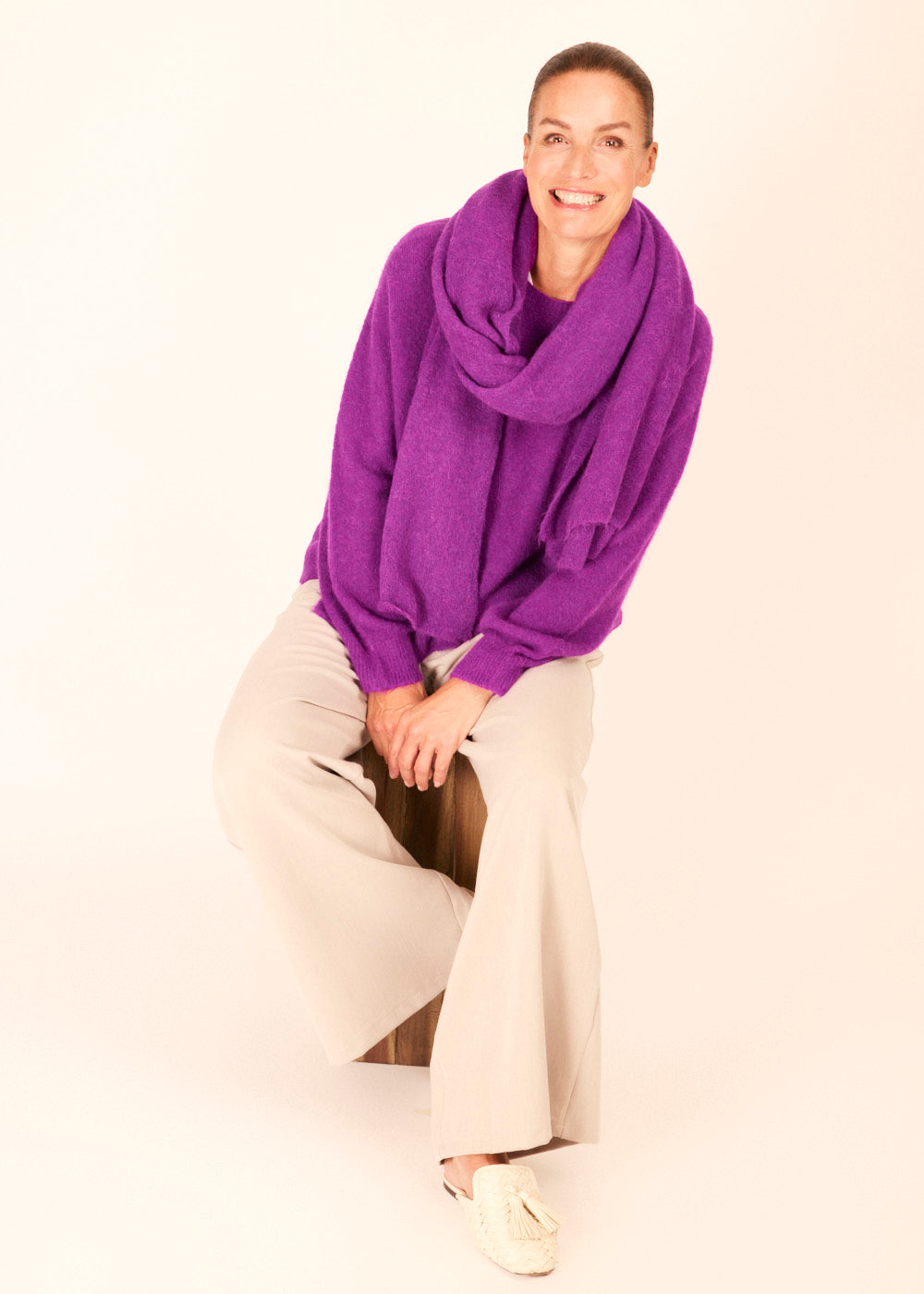 Gemütlicher Rundhalspullover aus einem Baby Alpaka Mix in einem wunderschönen Viola Ton. Der gemütliche Schnitt eignet sich ideal für jeden Tag. Ob du ihn zu Jeans für einen entspannten Look oder zu einer schickeren Hose für einen lässig-eleganten Auftritt kombinierst – dieser Pullover ist vielseitig einsetzbar.