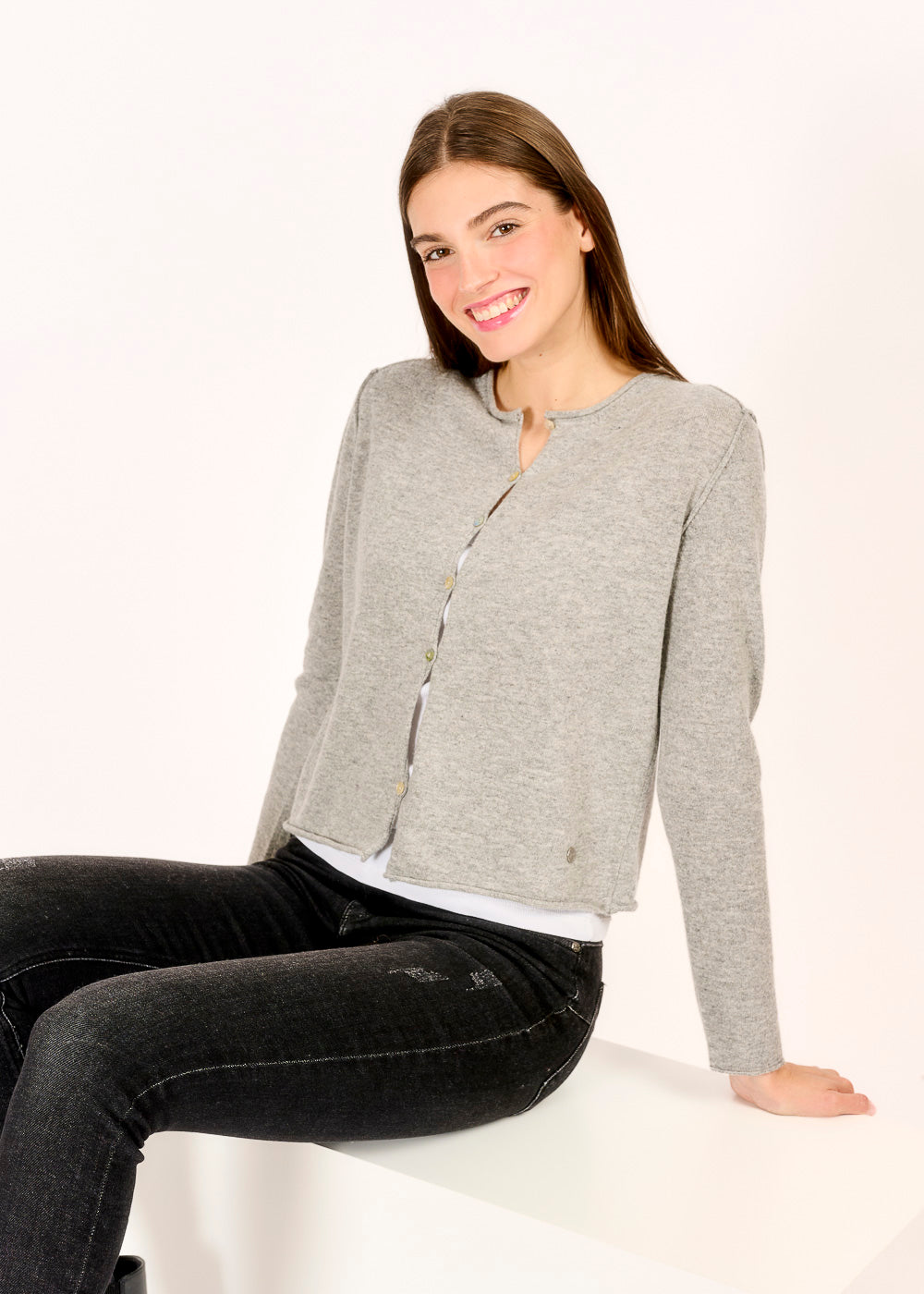 Kuschelig, stylish und vielseitig: Der graue Cardigan mit edler Rollkante passt perfekt zu deinem Look – ob lässig oder elegant. Einfach überwerfen und wohlfühlen!