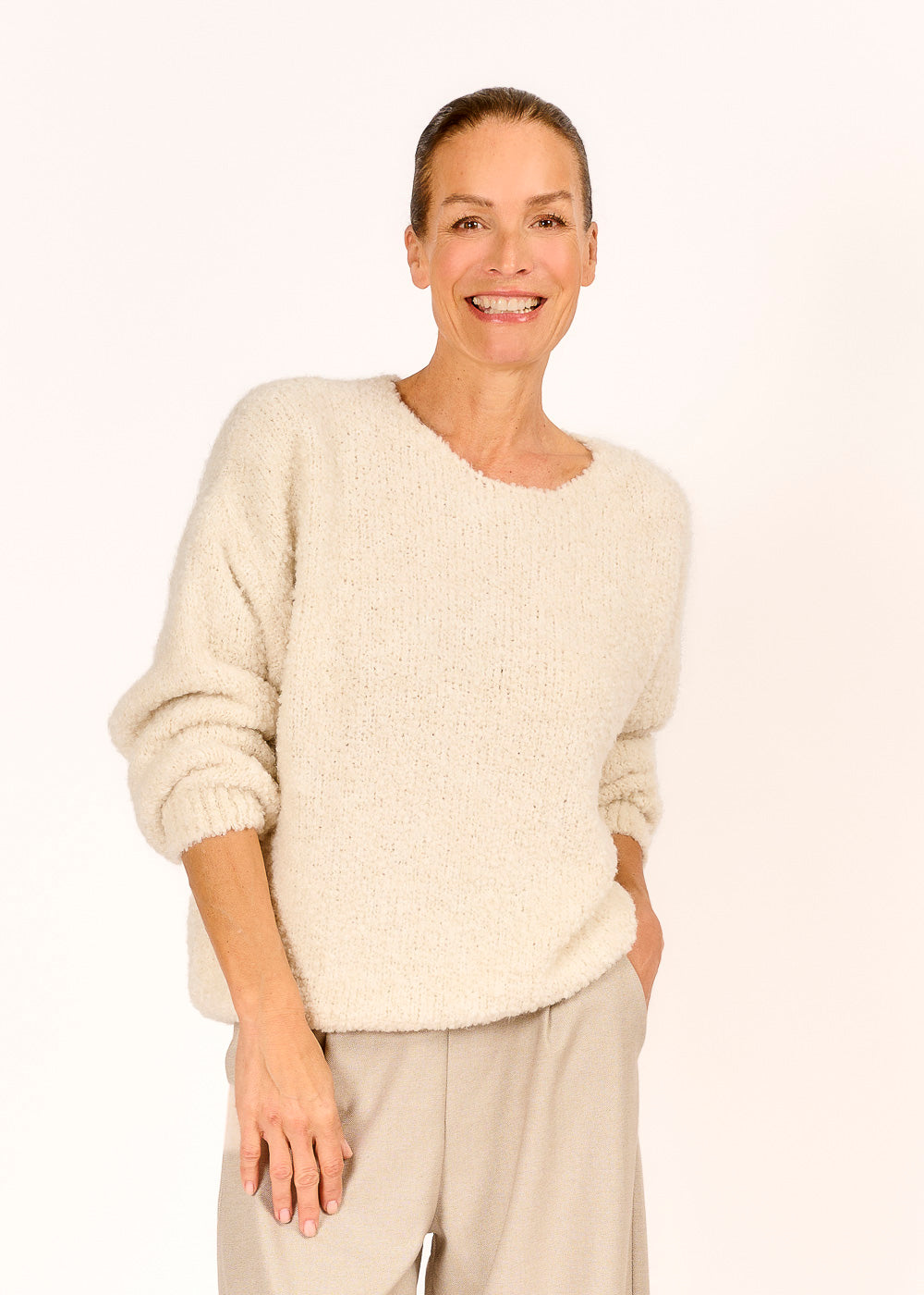 Kuschelig, stilvoll und vielseitig – dieser Bouclepullover in Beige ist dein perfekter Begleiter für gemütliche Tage und elegante Outfits. Weich und zeitlos im Design, ergänzt er deinen Look mit einer warmen, modernen Note.