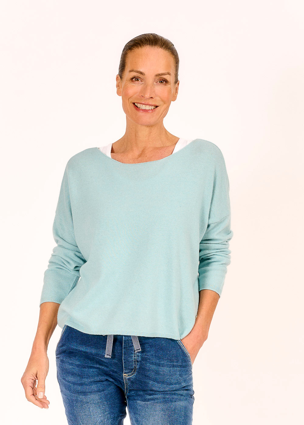 Dieser Cropped Pullover in zartem Hellblau verleiht deinem Outfit eine frische, moderne Note. Der 10 % Kaschmiranteil sorgt für ein unglaublich weiches Tragegefühl und macht den Pullover besonders luxuriös. Mit seinem trendigen Schnitt und der dezenten Farbe lässt sich der Pullover vielseitig kombinieren und ist ein echtes Must-have für jeden Kleiderschrank.