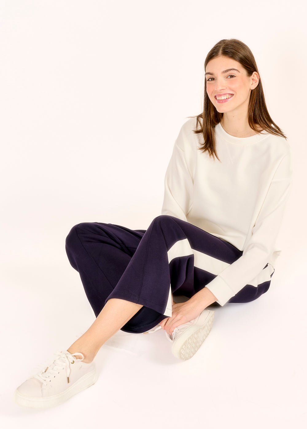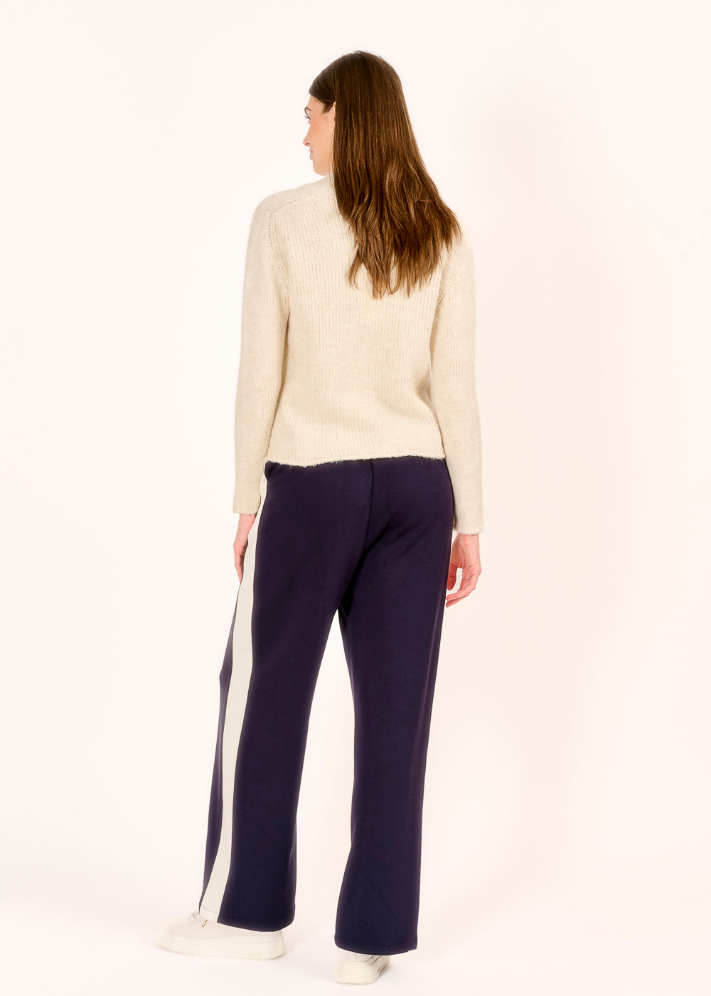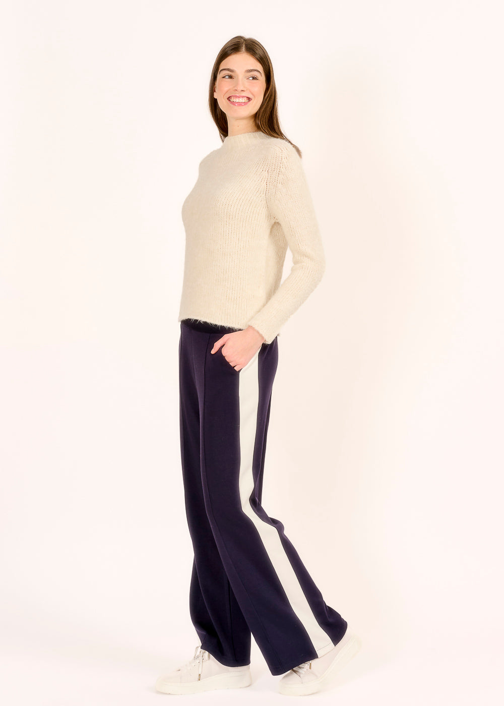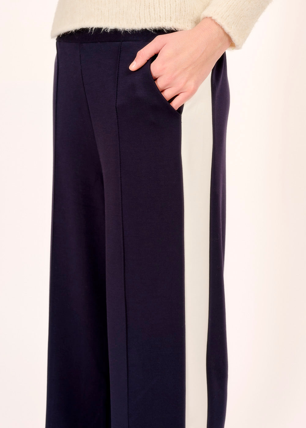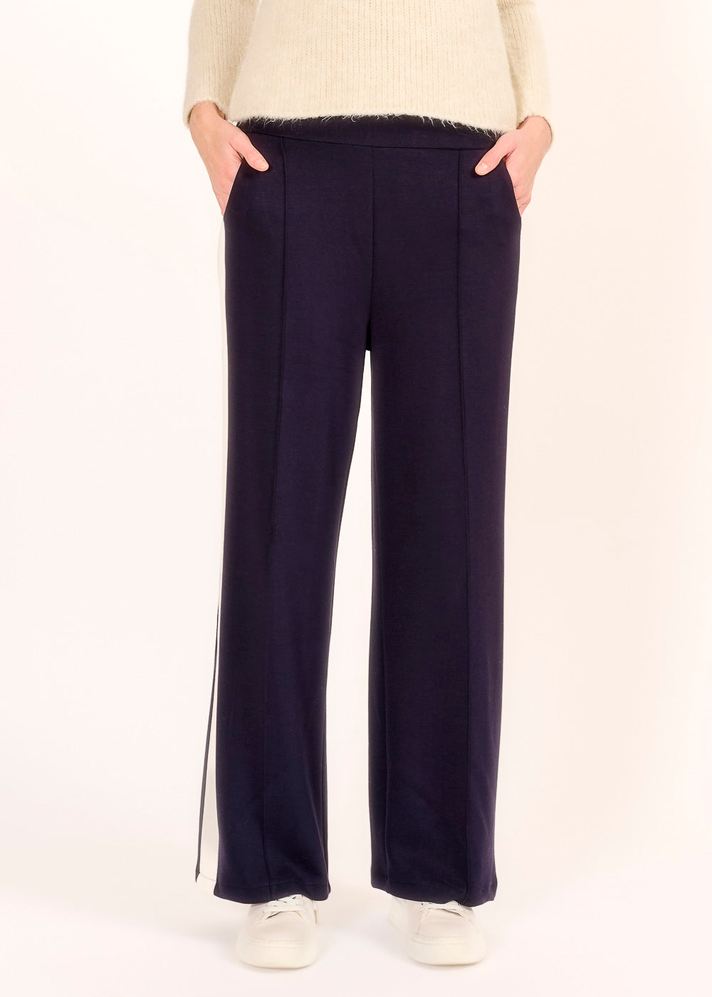 Diese dunkelblaue Hose mit weißem Seitenstreifen vereint moderne Eleganz mit einem angesagten, sportlich-modernen Look. Der kontrastierende Streifen verleiht der Hose eine stylische Dynamik und macht sie zum perfekten Kombipartner für lässige wie auch schickere Outfits.