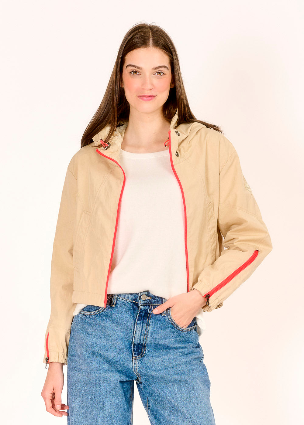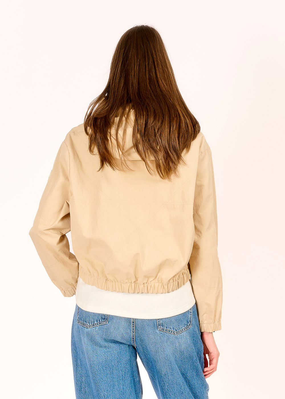 Diese kurze, lässige Baumwolljacke in der Farbe Sand ist der perfekte Begleiter für wechselhaftes Wetter. Dank ihres winddichten und wasserabweisenden Materials bietet sie optimalen Schutz, während der farblich abgesetzte Reißverschluss und die schrägen Eingriffstaschen für einen modernen Look sorgen. Die ungefütterte, leichte Qualität macht sie ideal für die Übergangszeit und vielseitig kombinierbar.