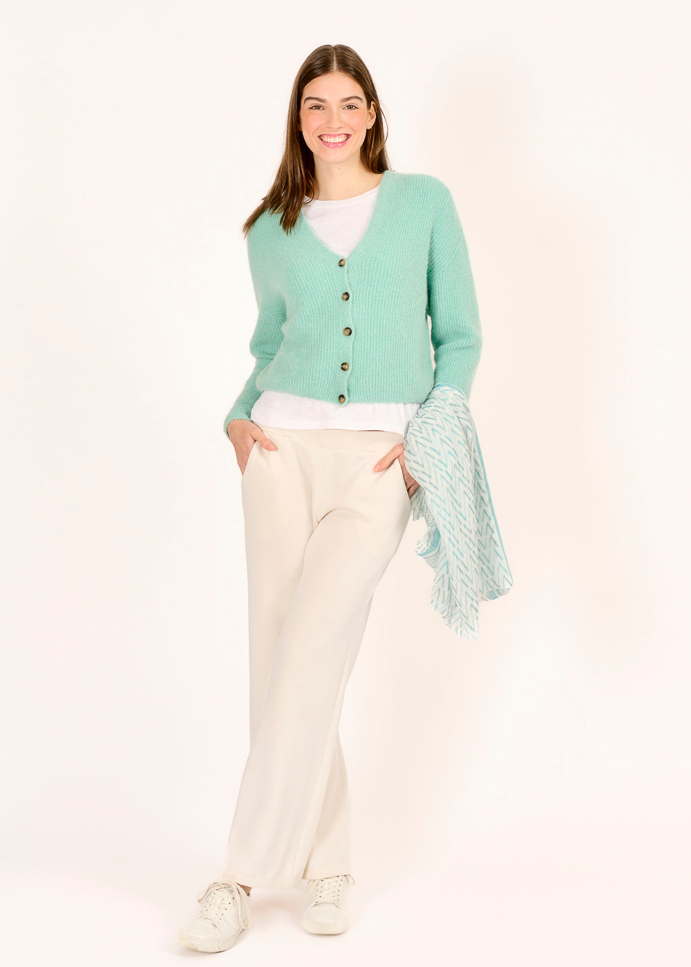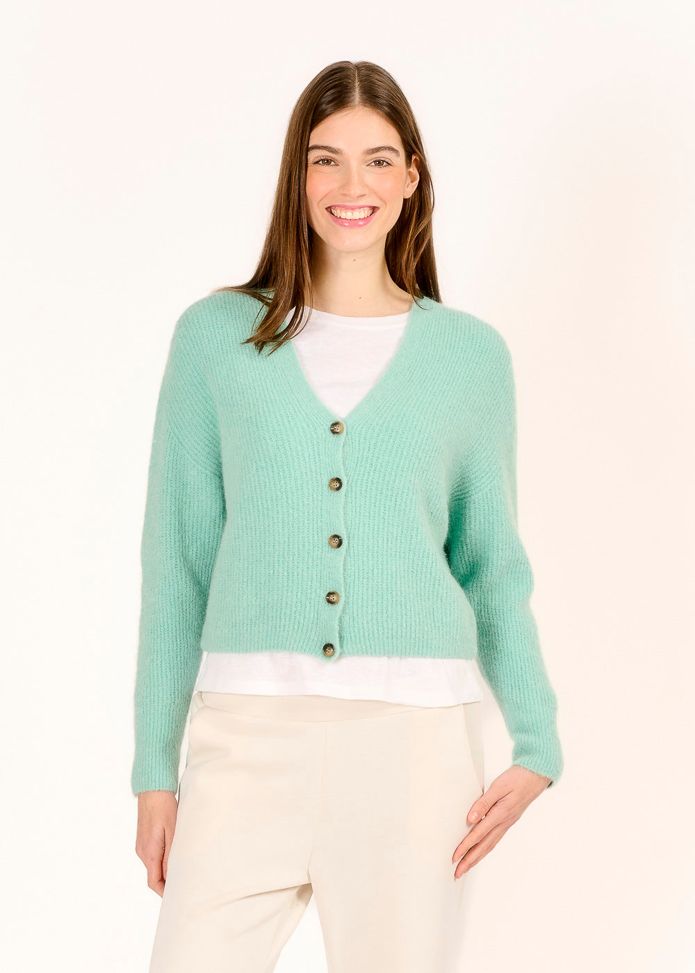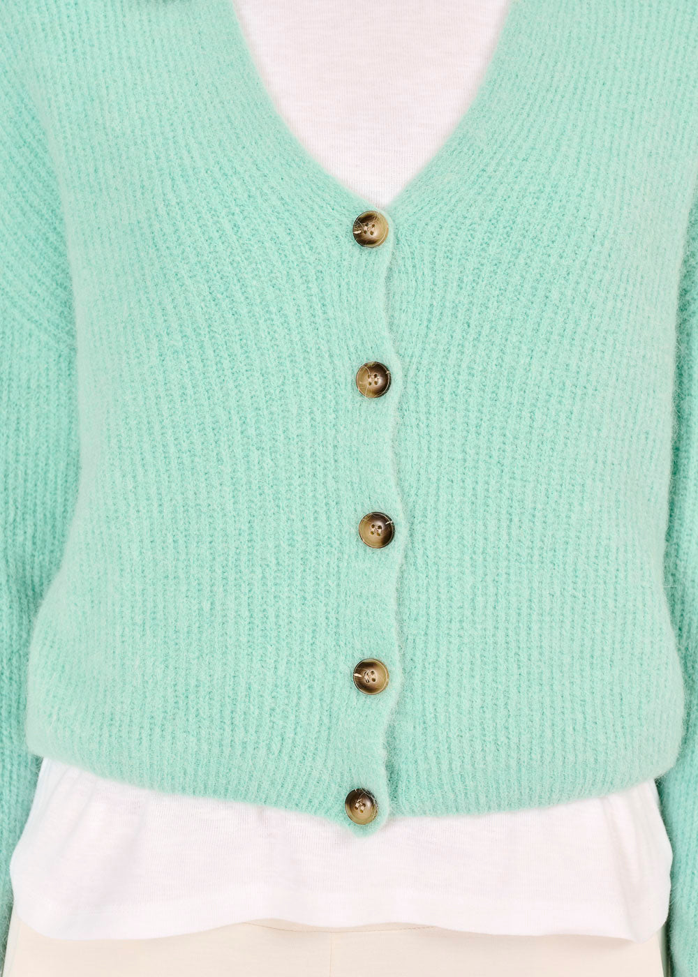 Dieser kurz geschnittene Rippencardigan in trendigem Menta ist ein echtes Highlight für jede Garderobe. Der weiche Stoff schmiegt sich angenehm an und sorgt für maximalen Tragekomfort. Ob über Tops oder Blusen getragen – er verleiht jedem Look eine frische und moderne Note.