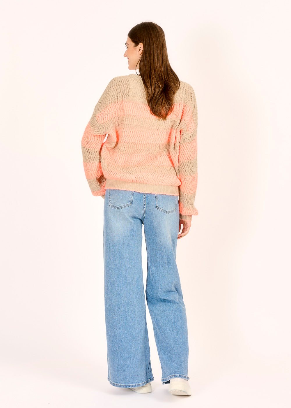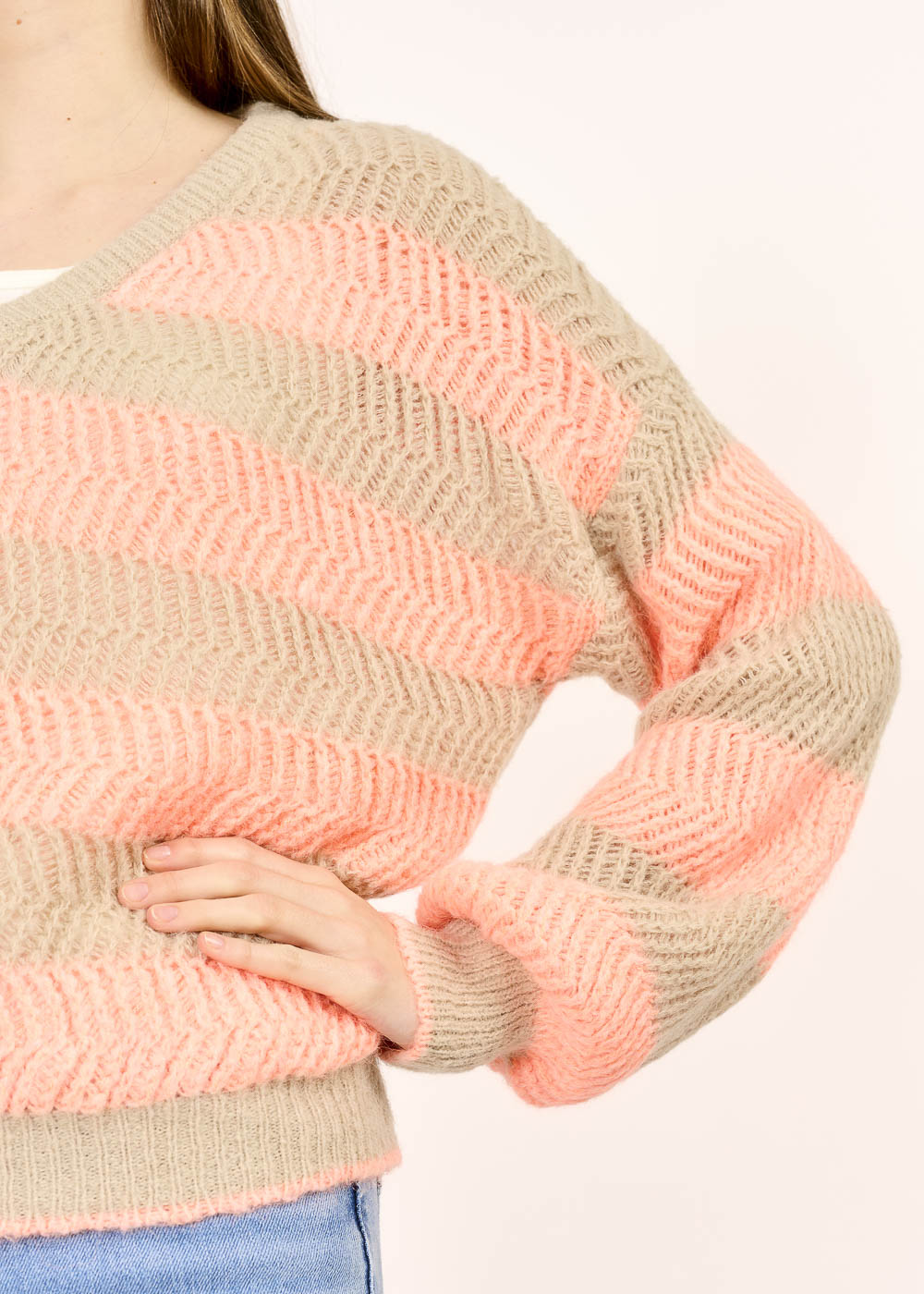 Dieser Blockstreifen-Pulli in der zarten Farbe Pesca begeistert mit seinem luftig-leichten Ajour-Strick. Das raffinierte Muster verleiht ihm eine feminine Note und macht ihn zum perfekten Begleiter für jede Saison.