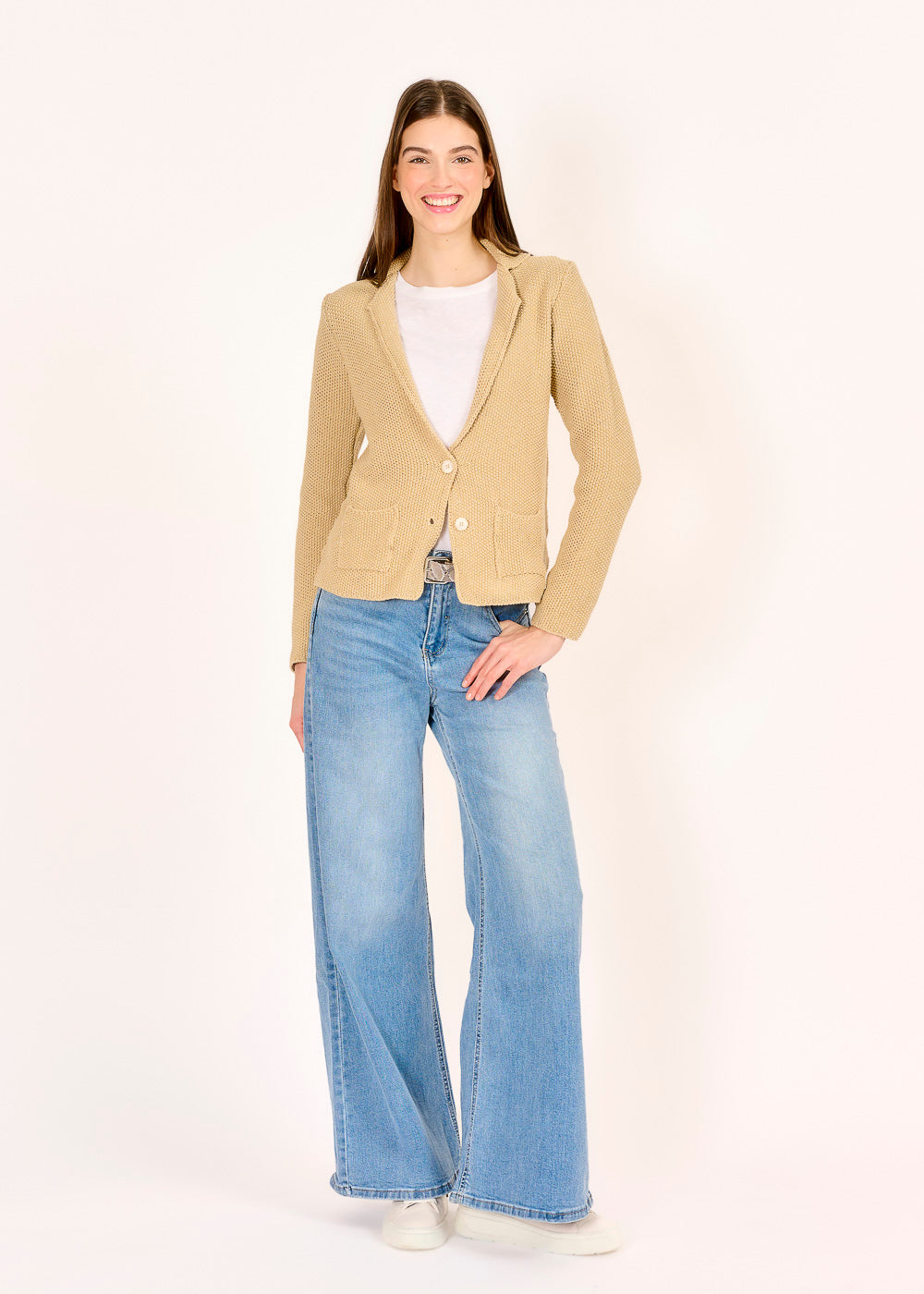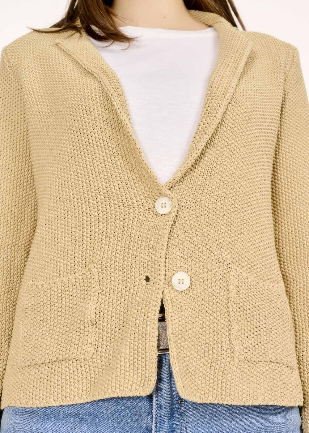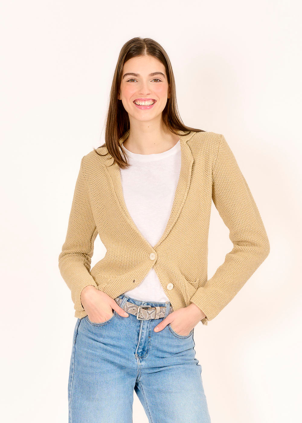 Dieser Strickblazer in der dezenten Farbe Beige ist ein zeitloser Begleiter für jede Gelegenheit. Gefertigt aus weichem Baumwollgarn, überzeugt er mit angenehmem Tragekomfort und einer perfekten Passform.