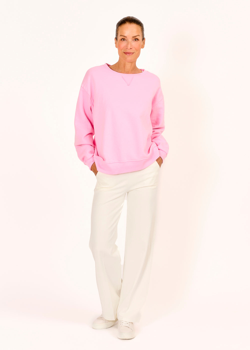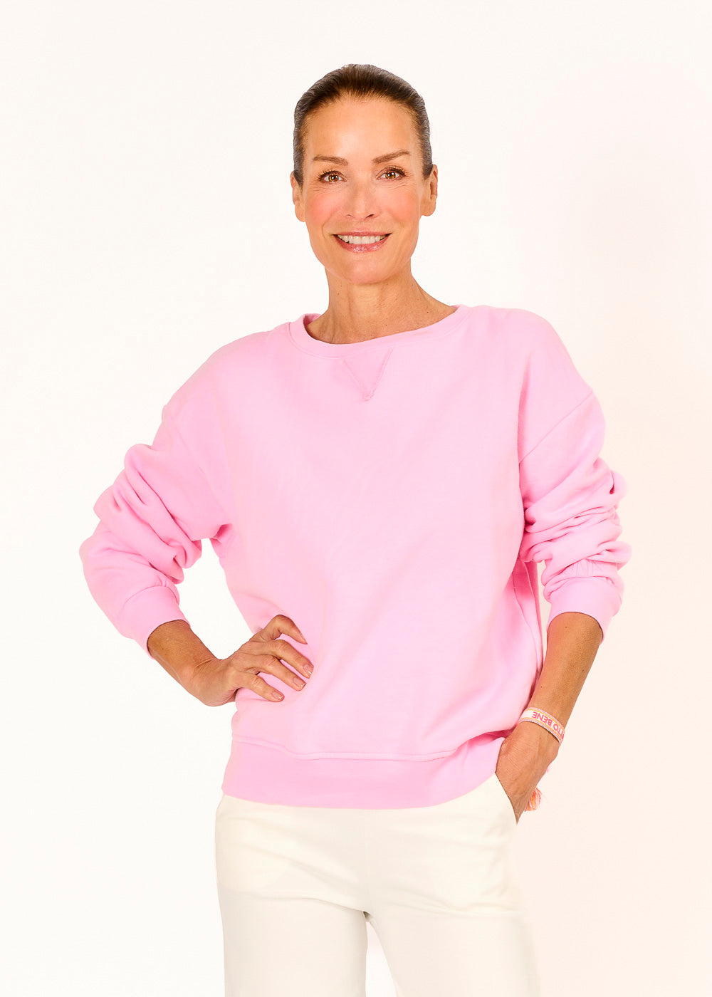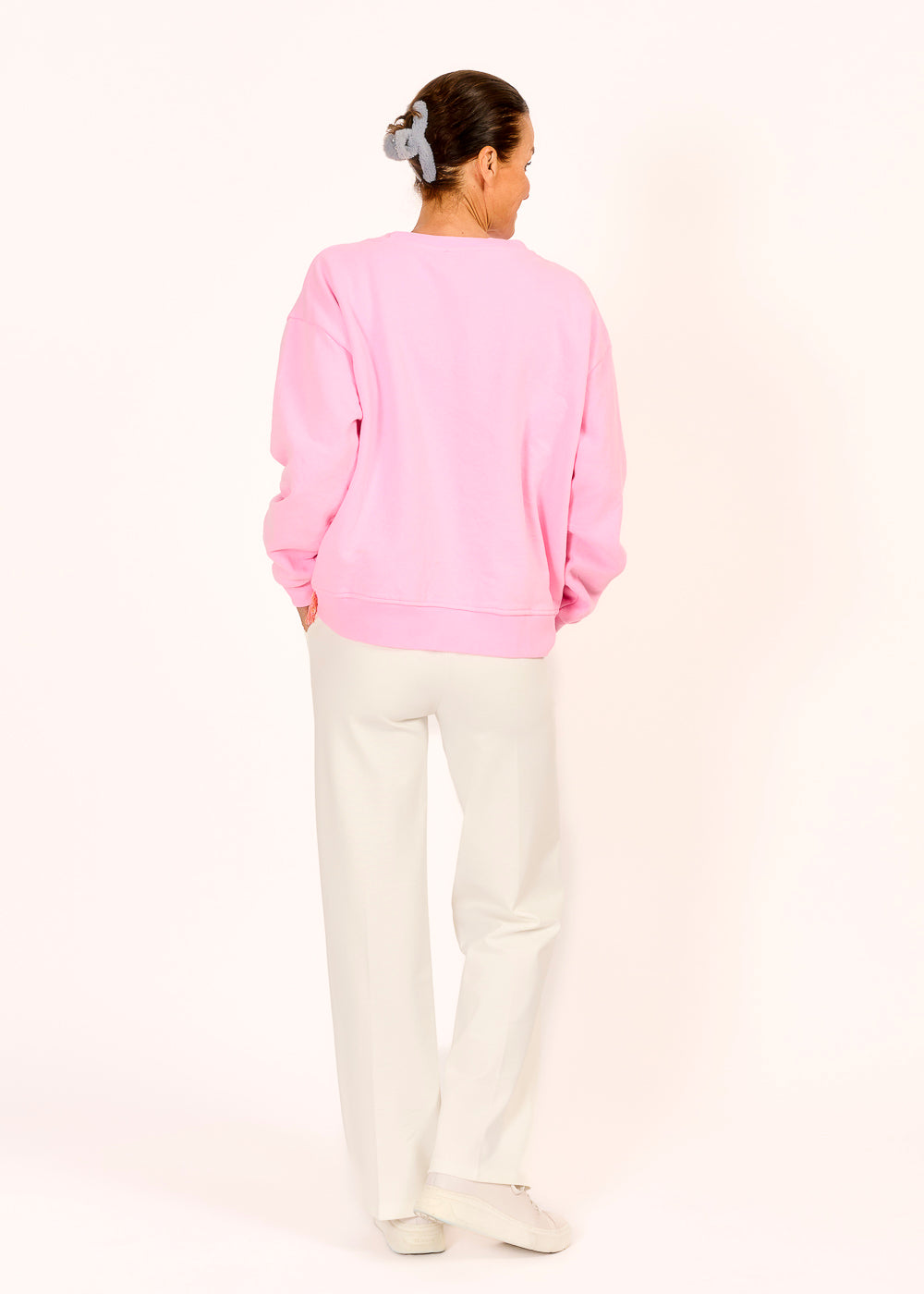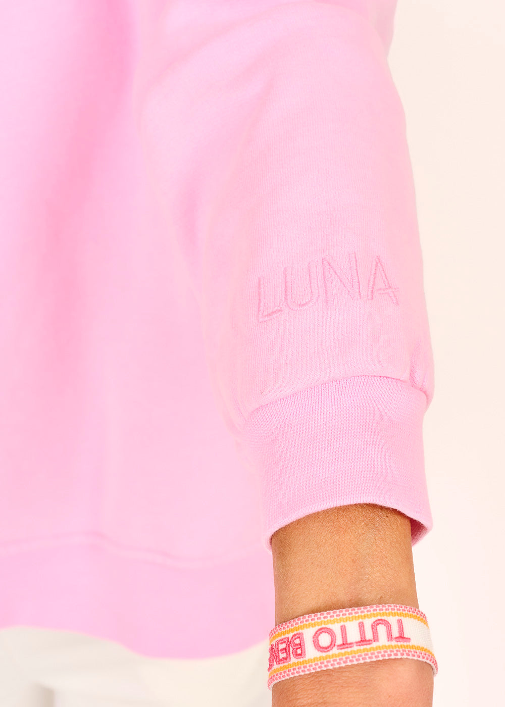 Dieses Sweatshirt in sanftem Rosa überzeugt mit seinem lässigen Schnitt und einem Hauch von Besonderheit. Die filigrane Stickerei des italienischen Wortes „Luna“ – auf Deutsch „Mond“ – setzt einen charmanten Akzent auf der Vorderseite. Weich und bequem, wird es schnell zum Lieblingsstück für entspannte Tage mit Stil.
