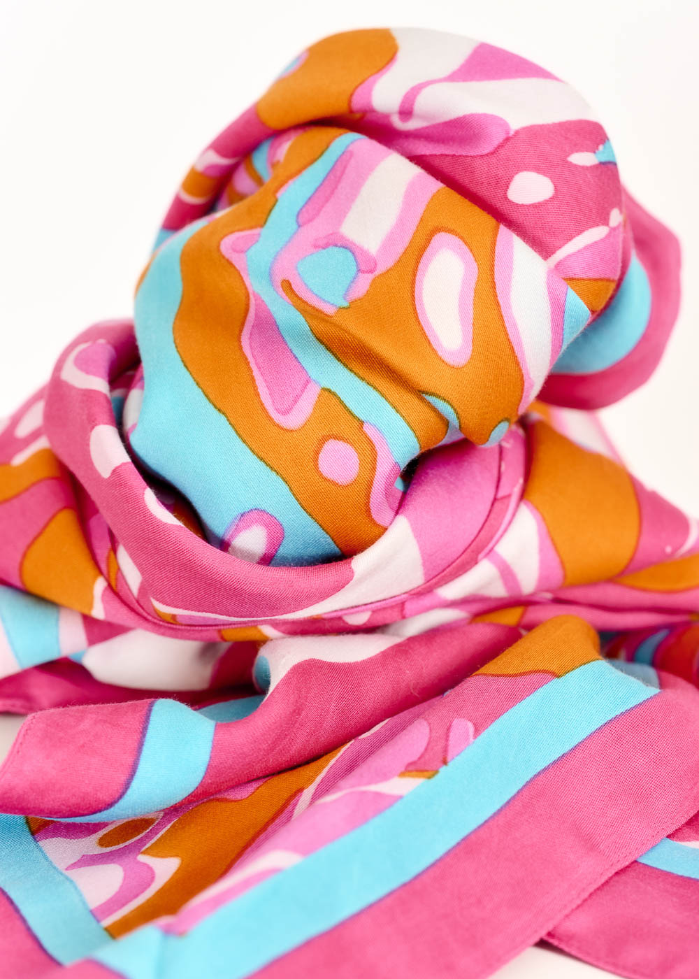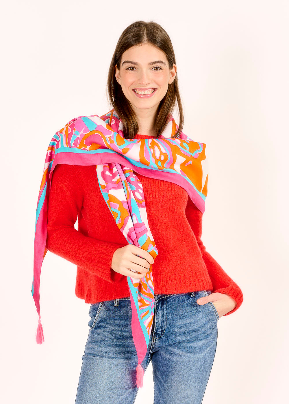 Dieses Dreieckstuch mit seinem bunten, lebendigen Muster bringt Farbe und Frische in jeden Look. Leicht und vielseitig kombinierbar, ist es das perfekte Accessoire für modebewusste Akzente.