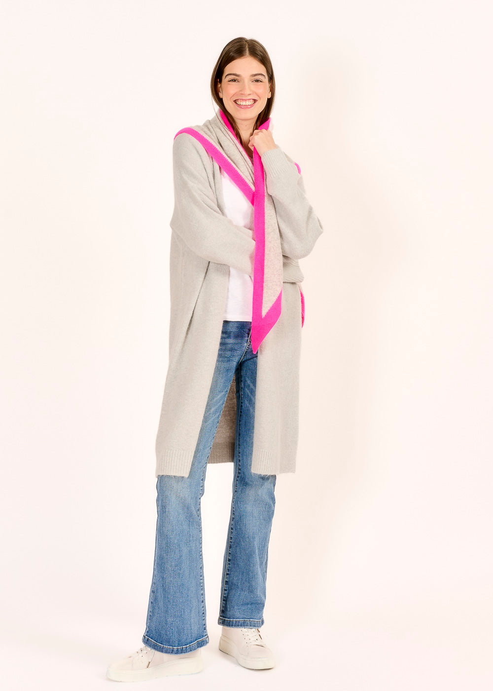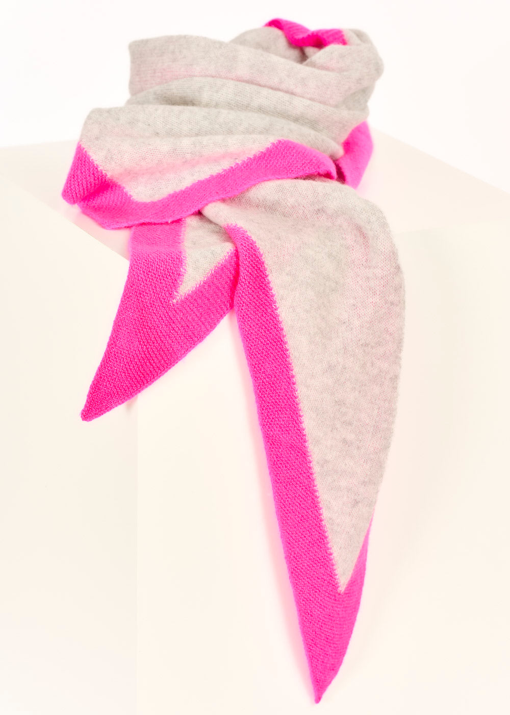 Dieses luxuriöse Kaschmirdreieck in elegantem Grigio erhält durch die Neon-Fuchsia-Kante einen modernen und auffälligen Akzent. Kuschelig weich und stilvoll, ist es das ideale Accessoire für besondere Looks mit einem Hauch von Extravaganz.