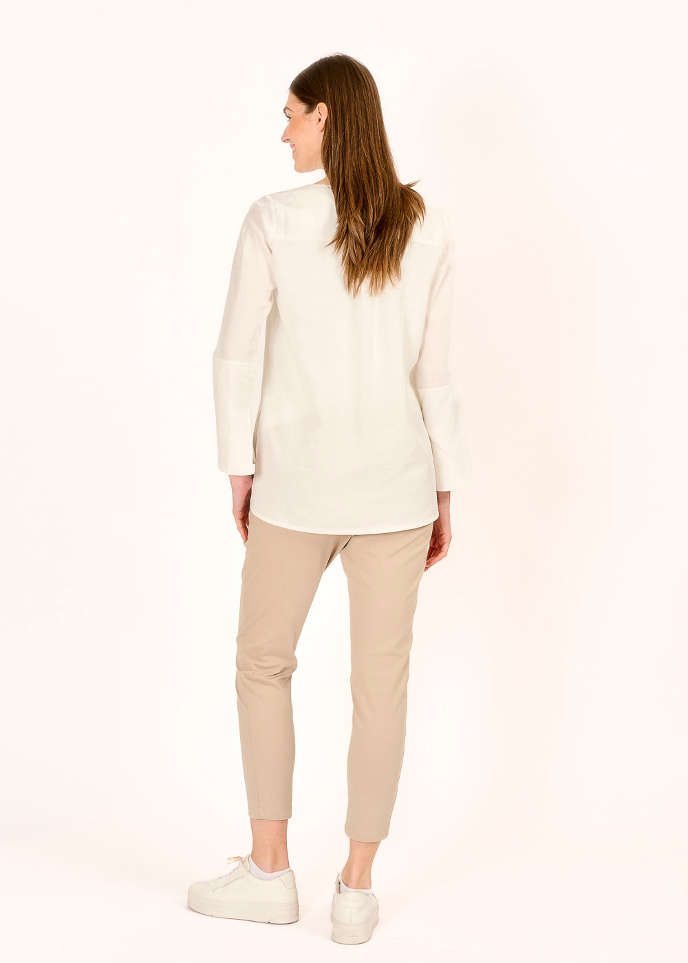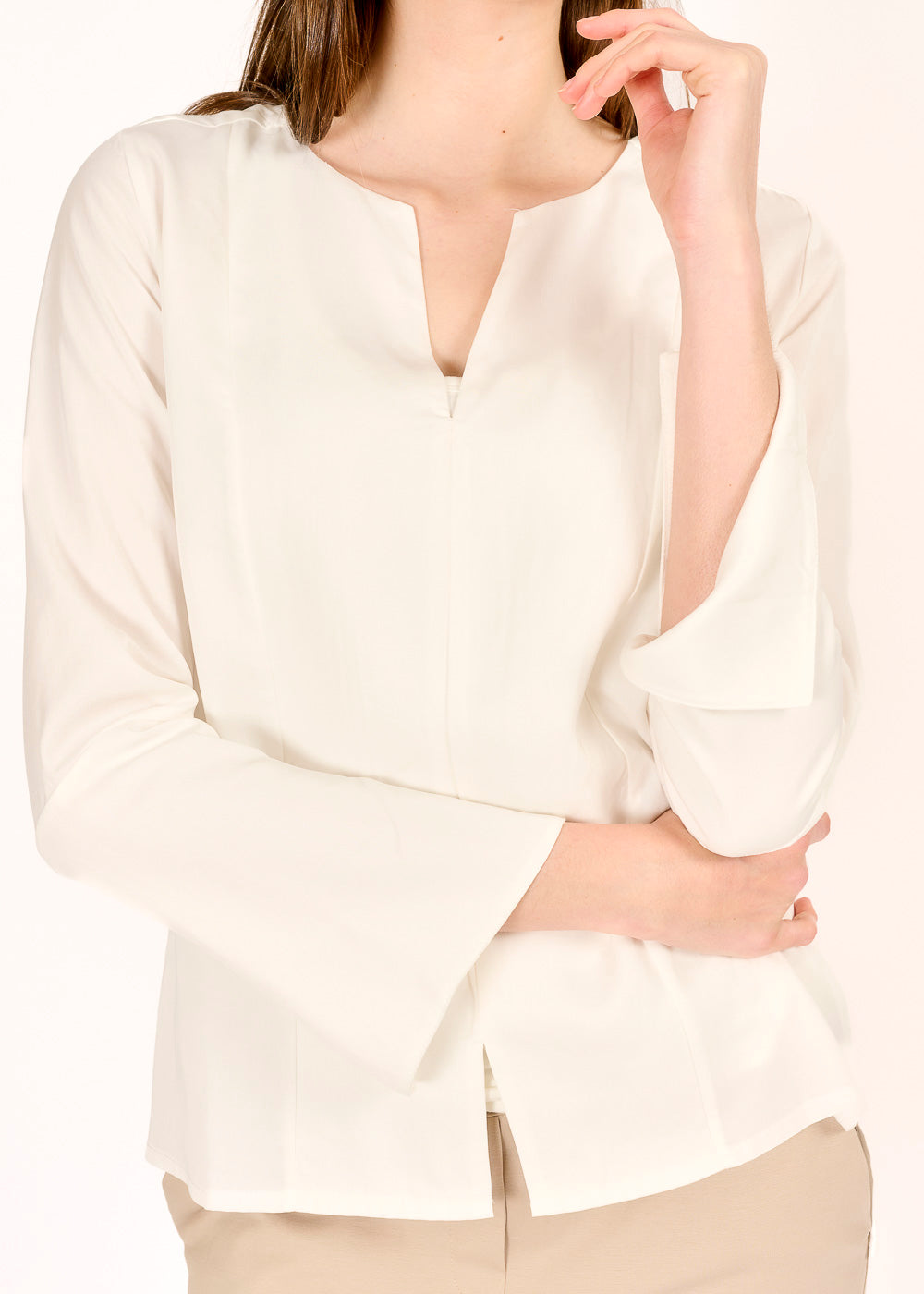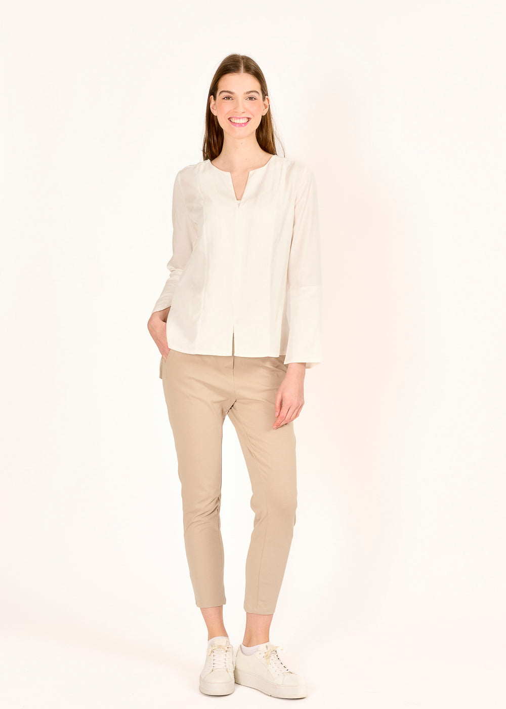 Diese edle Bluse in der Farbe Bianco-Ottico überzeugt mit raffinierten Details wie einer Falte auf dem Rücken und dezenten kleinen Schlitzen vorne, an den Seiten und an den Ärmeln. Der fließende Schnitt verleiht ihr eine elegante Silhouette – perfekt für stilvolle Auftritte.