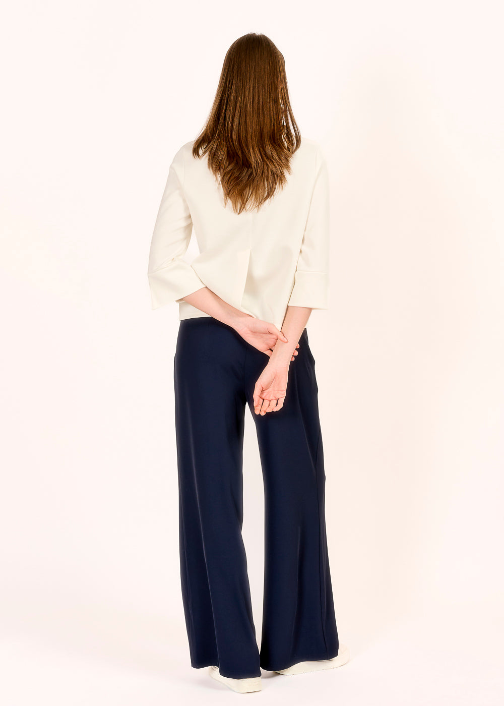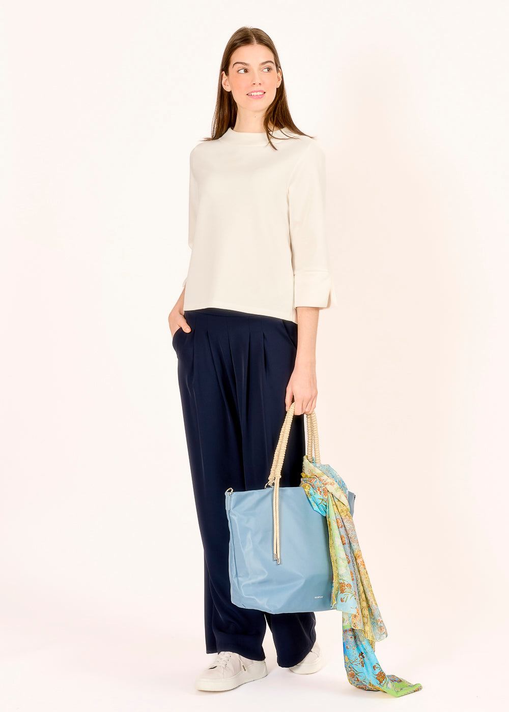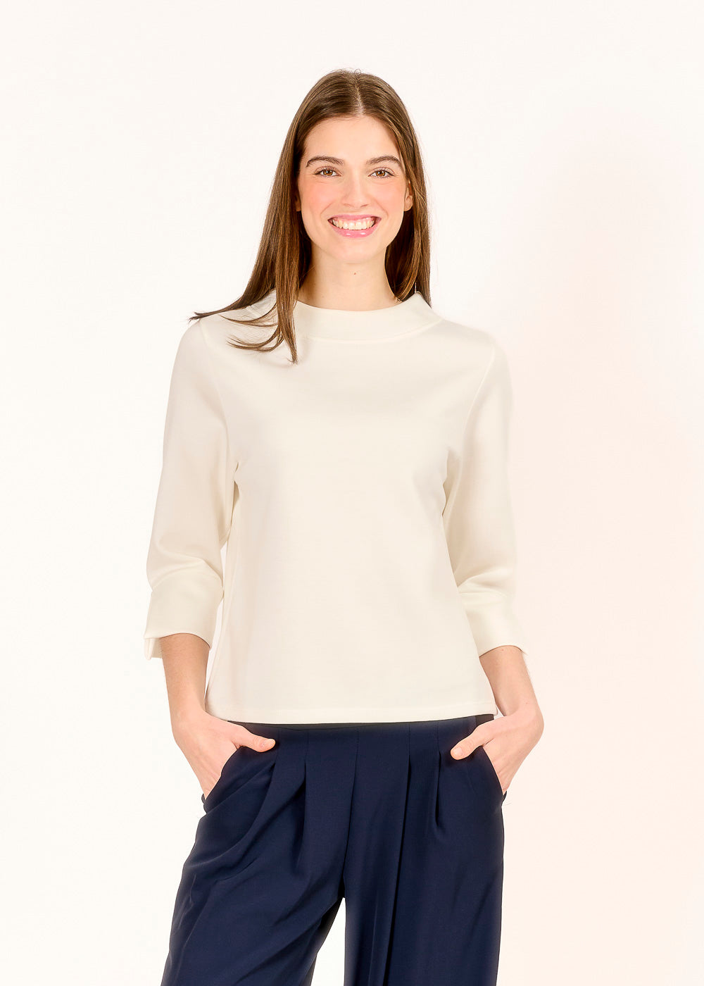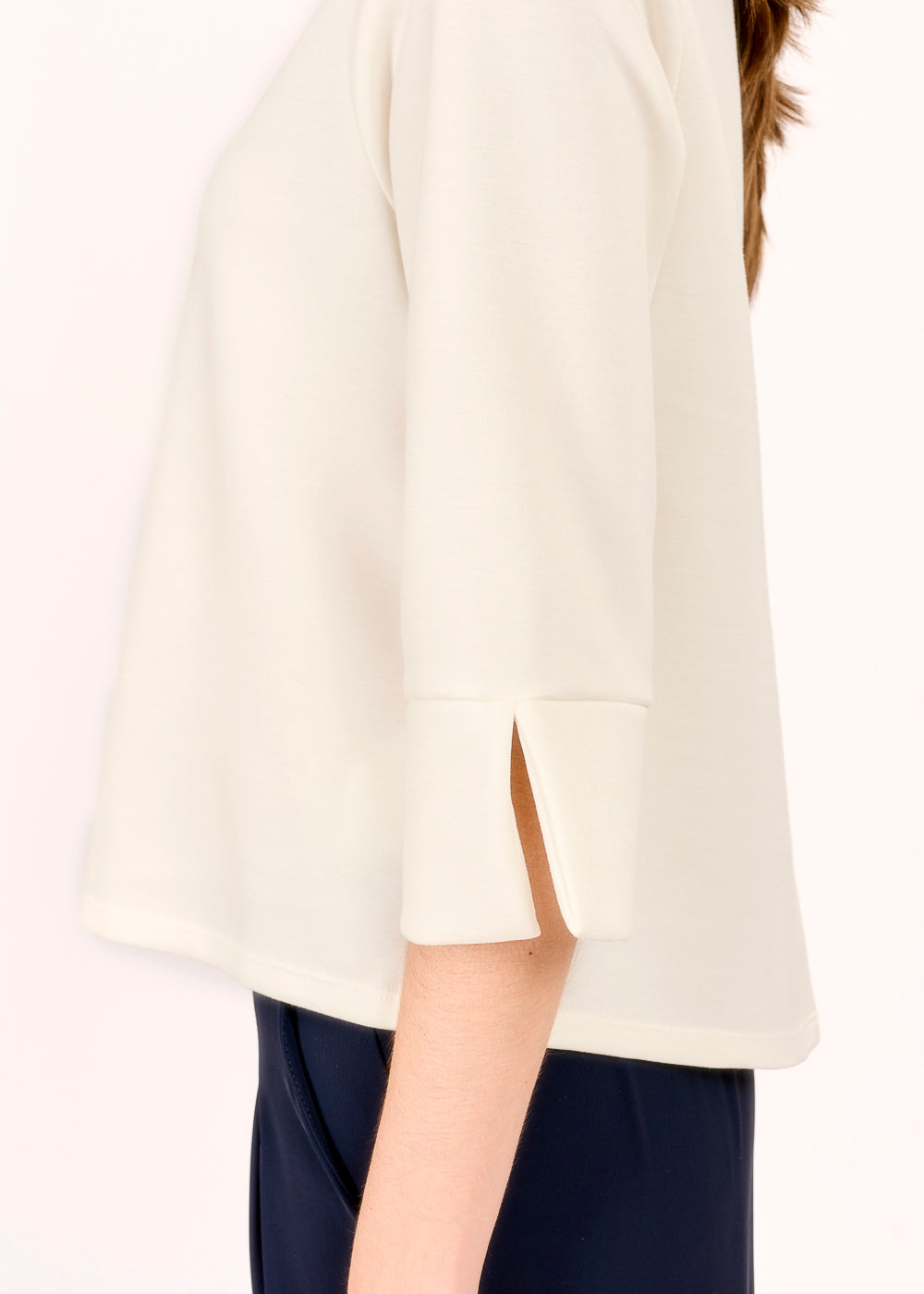 Dieses weiße Shirt mit einem eleganten Schlitz auf der Rückseite und U-Boot-Ausschnitt verleiht deinem Look eine moderne, feminine Note. Der weiche Stoff und die lässige Passform machen es zu einem vielseitigen Begleiter für viele Anlässe.
