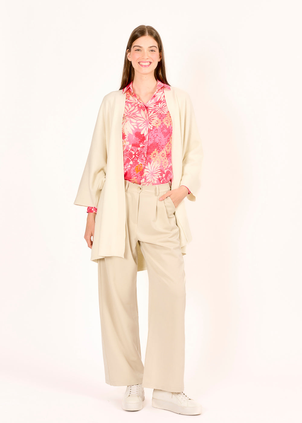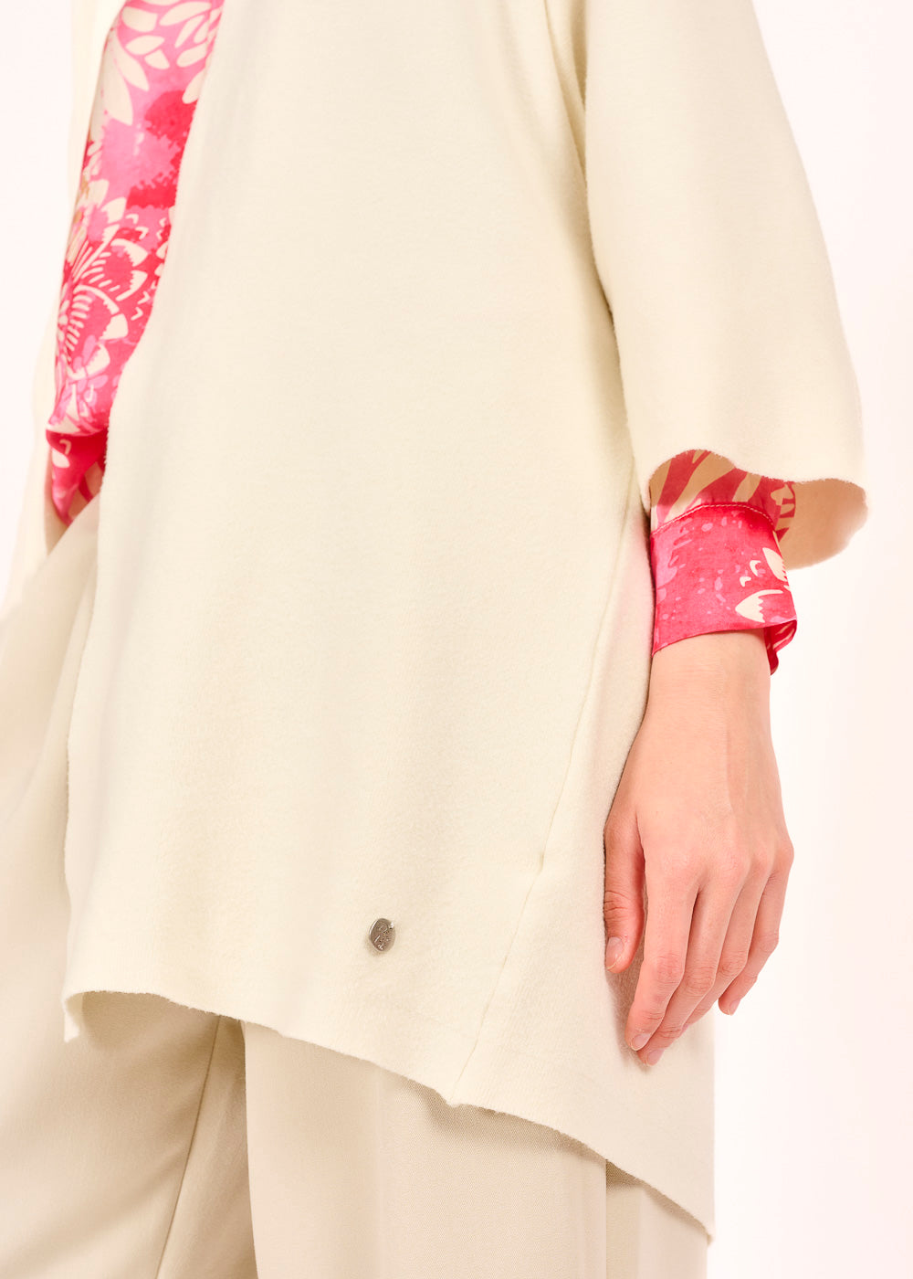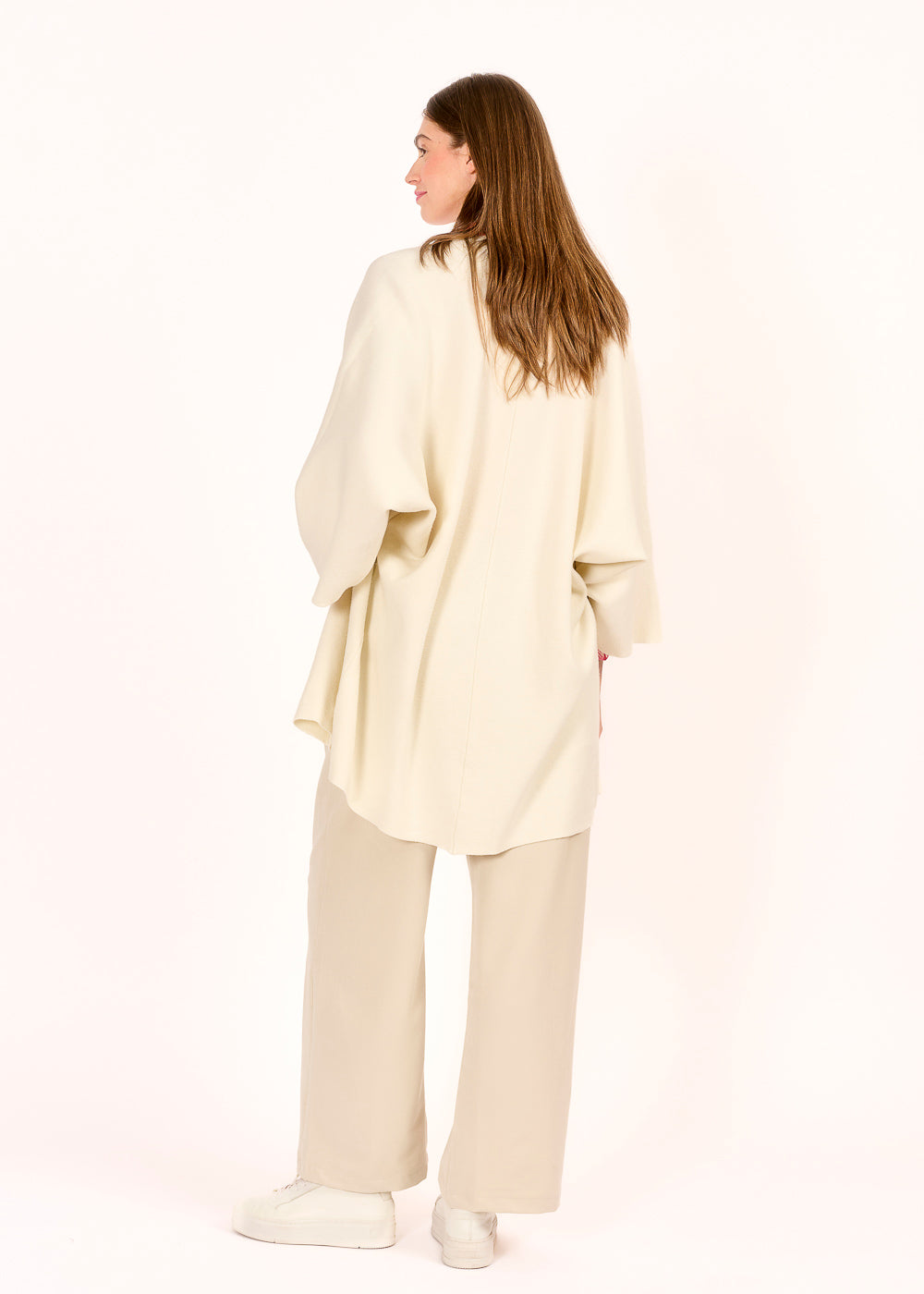 Dieser edle Kimonocardigan in der Farbe Panna besticht durch seine zeitlose Eleganz und fließende Silhouette. Die dezente, neutrale Farbe macht ihn zum vielseitigen Begleiter, der sich mühelos kombinieren lässt. Perfekt für die Übergangszeit, verleiht er jedem Outfit eine stilvolle und moderne Note.