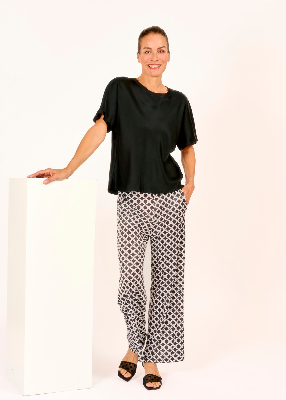 Dieses Satin Shirt in klassischem Schwarz vereint lässigen Chic mit eleganter Ausstrahlung. Der fließende Stoff verleiht dem Shirt eine edle Note und sorgt für ein angenehmes Tragegefühl. Ob zu Jeans oder zum schicken Rock – dieses Oberteil passt sich jedem Look stilvoll an.
