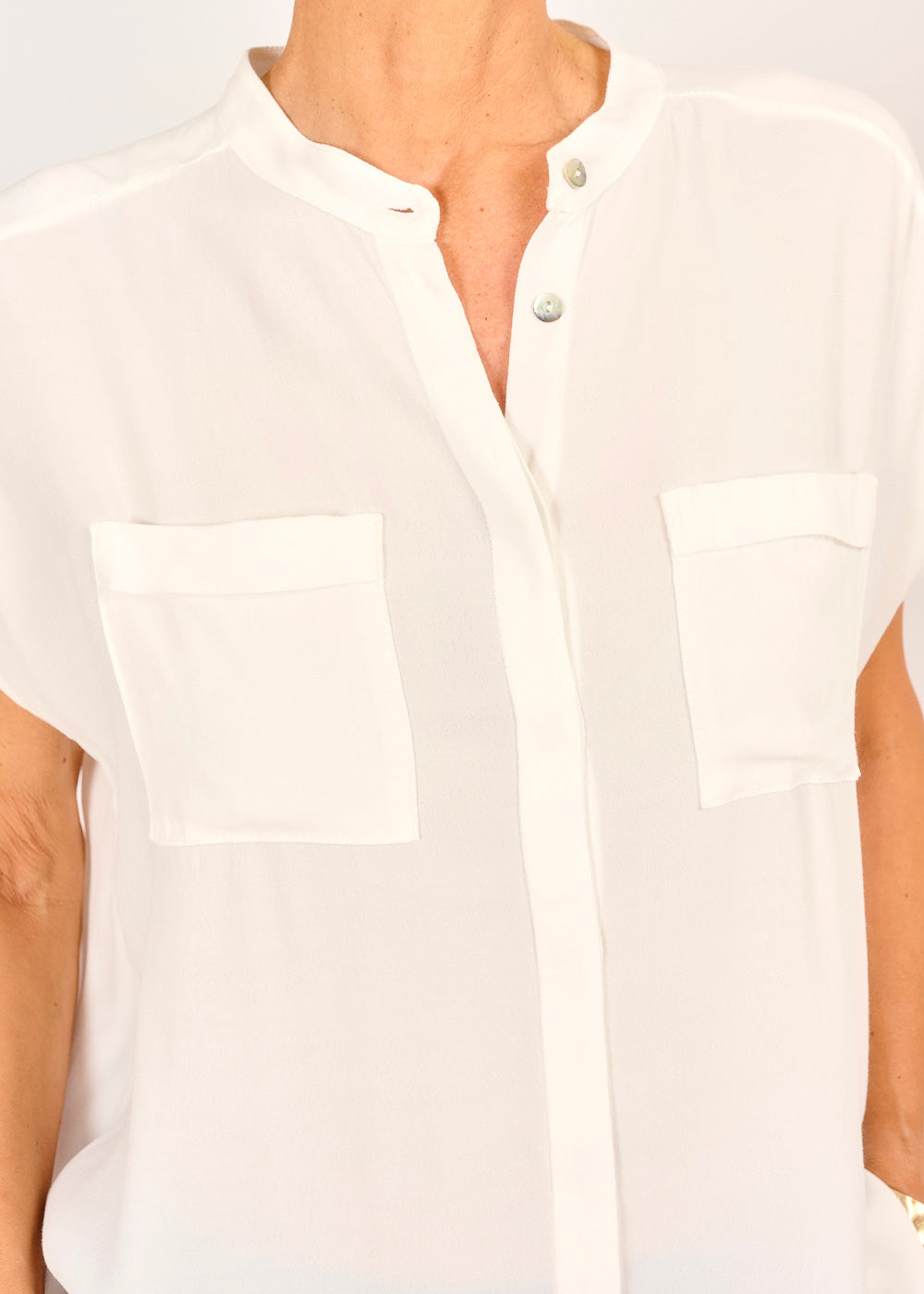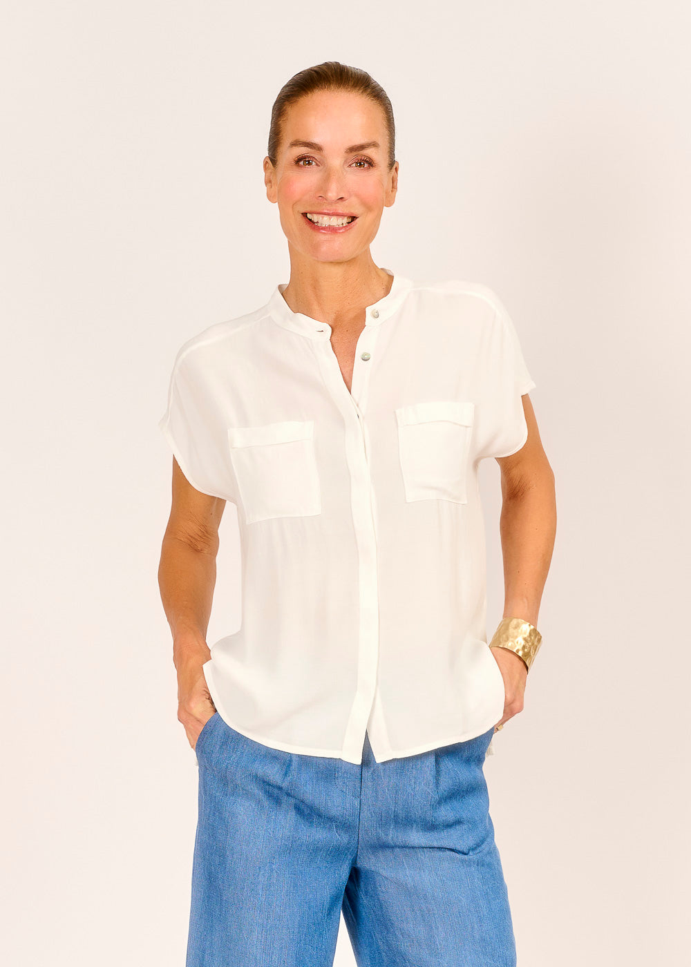 Diese weiße Viskosebluse mit kurzen Ärmeln und aufgesetzten Taschen vereint lässigen Komfort mit einem Hauch Eleganz. Der fließende Schnitt macht sie zum idealen Begleiter für stilvolle Everyday-Looks.