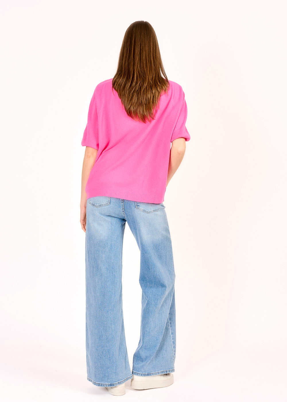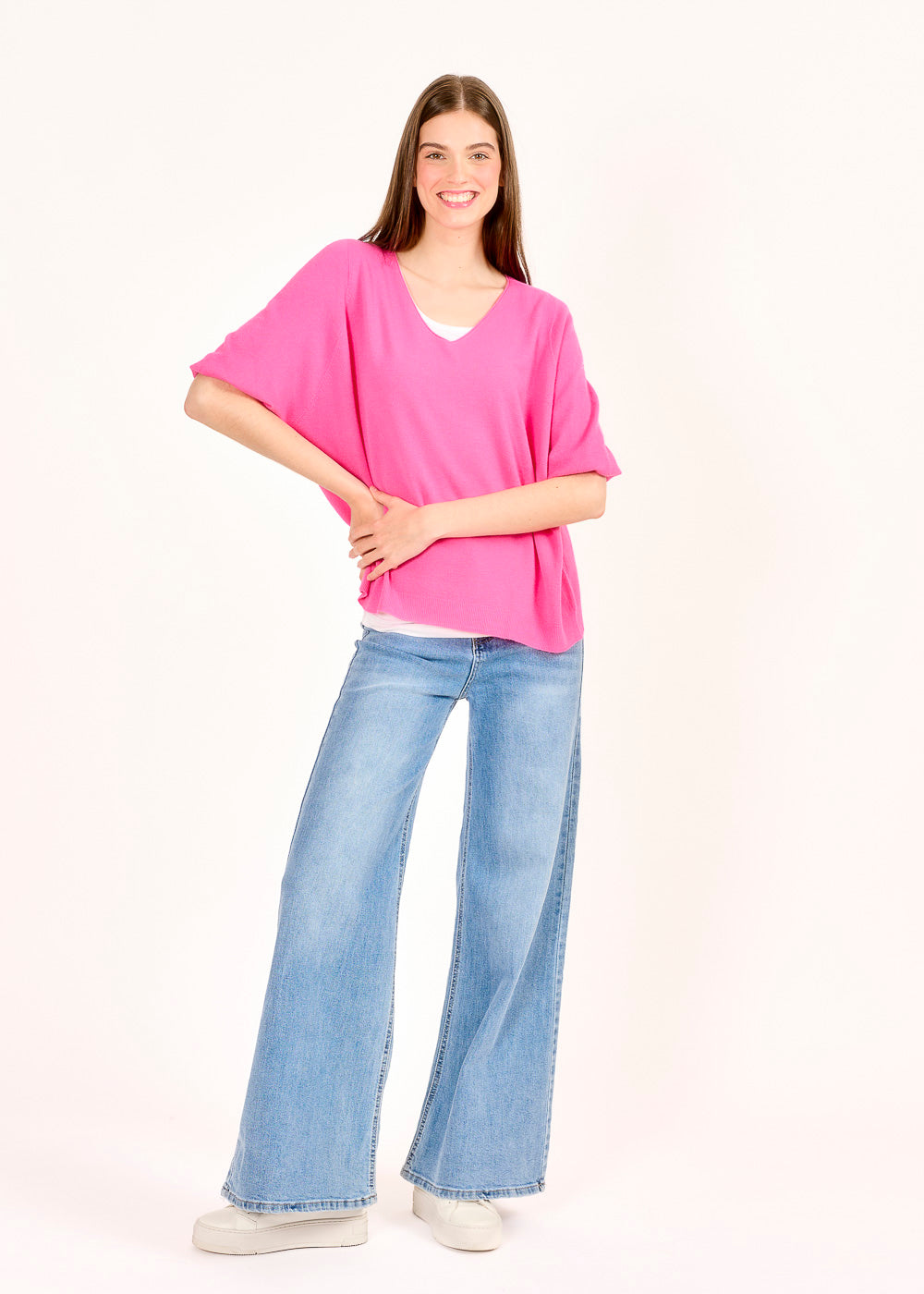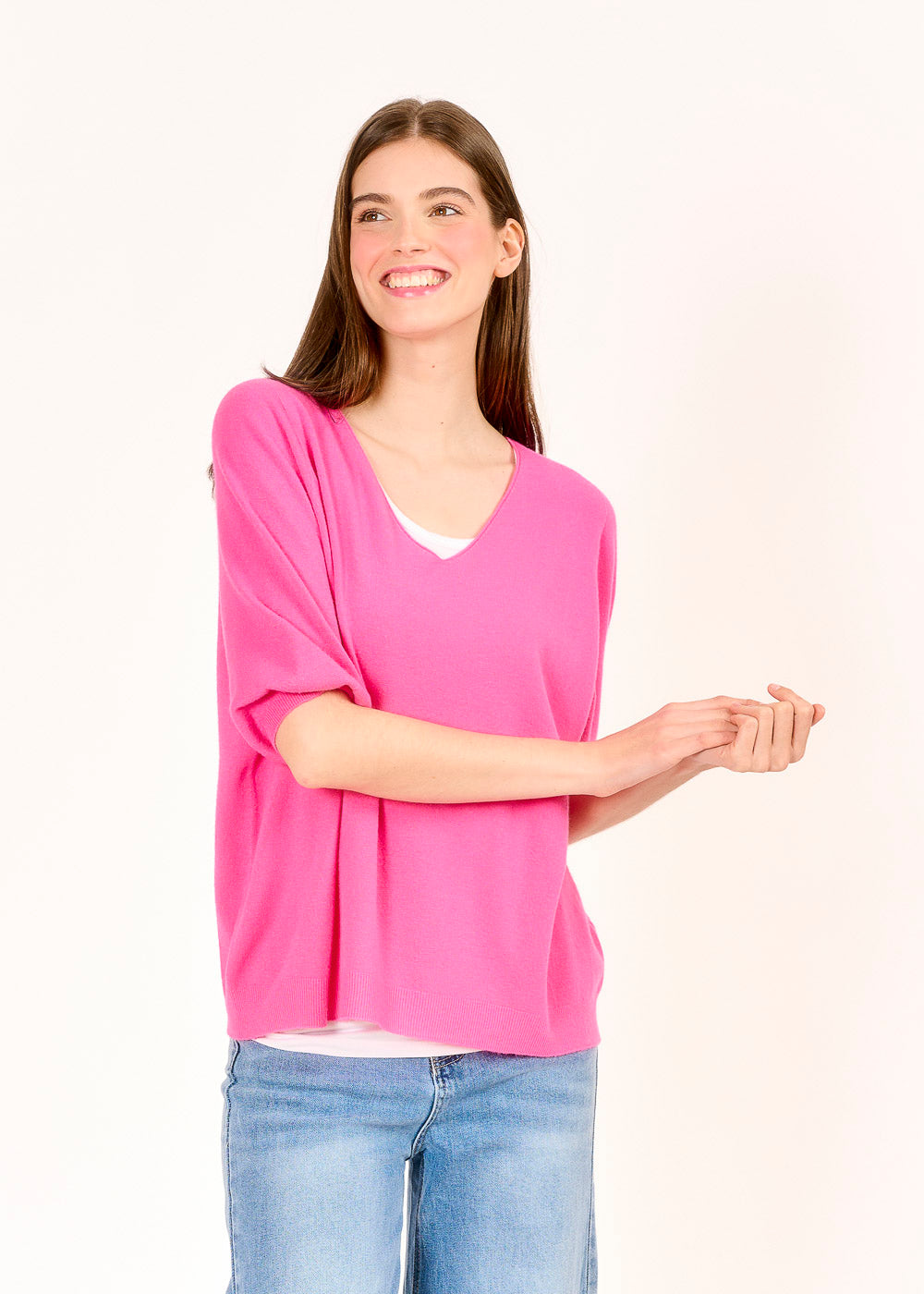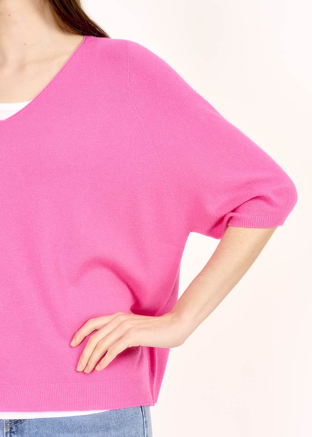 Dieser lässige Fledermauspullover in zartem Rosa verleiht deinem Look eine entspannte, aber dennoch stilvolle Note. Der V-Ausschnitt sorgt für eine schmeichelhafte Silhouette und macht ihn zum idealen Allrounder für deinen Casual-Look.