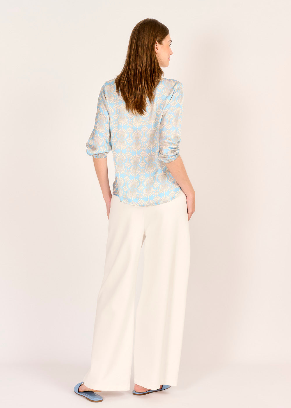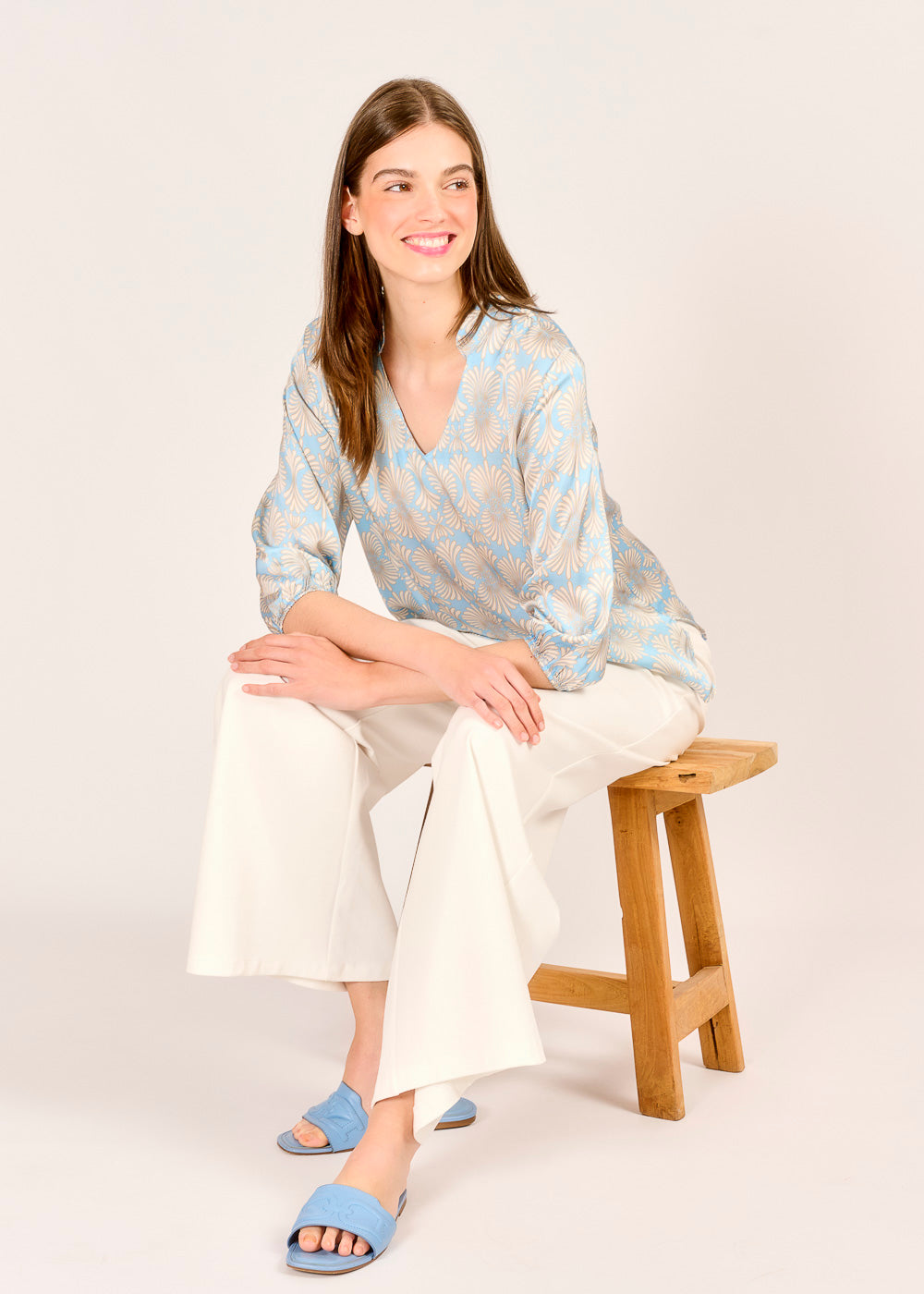 Diese Tunika-Bluse mit beige-blauem Print begeistert mit einem stilvollen Muster und einem leichten, fließenden Fall. Die 3/4-Ärmel mit Gummizug bieten Komfort und Flexibilität – ideal für wechselhaftes Wetter. Für einen rundum abgestimmten Look lässt sie sich perfekt mit der passenden Hose kombinieren.
