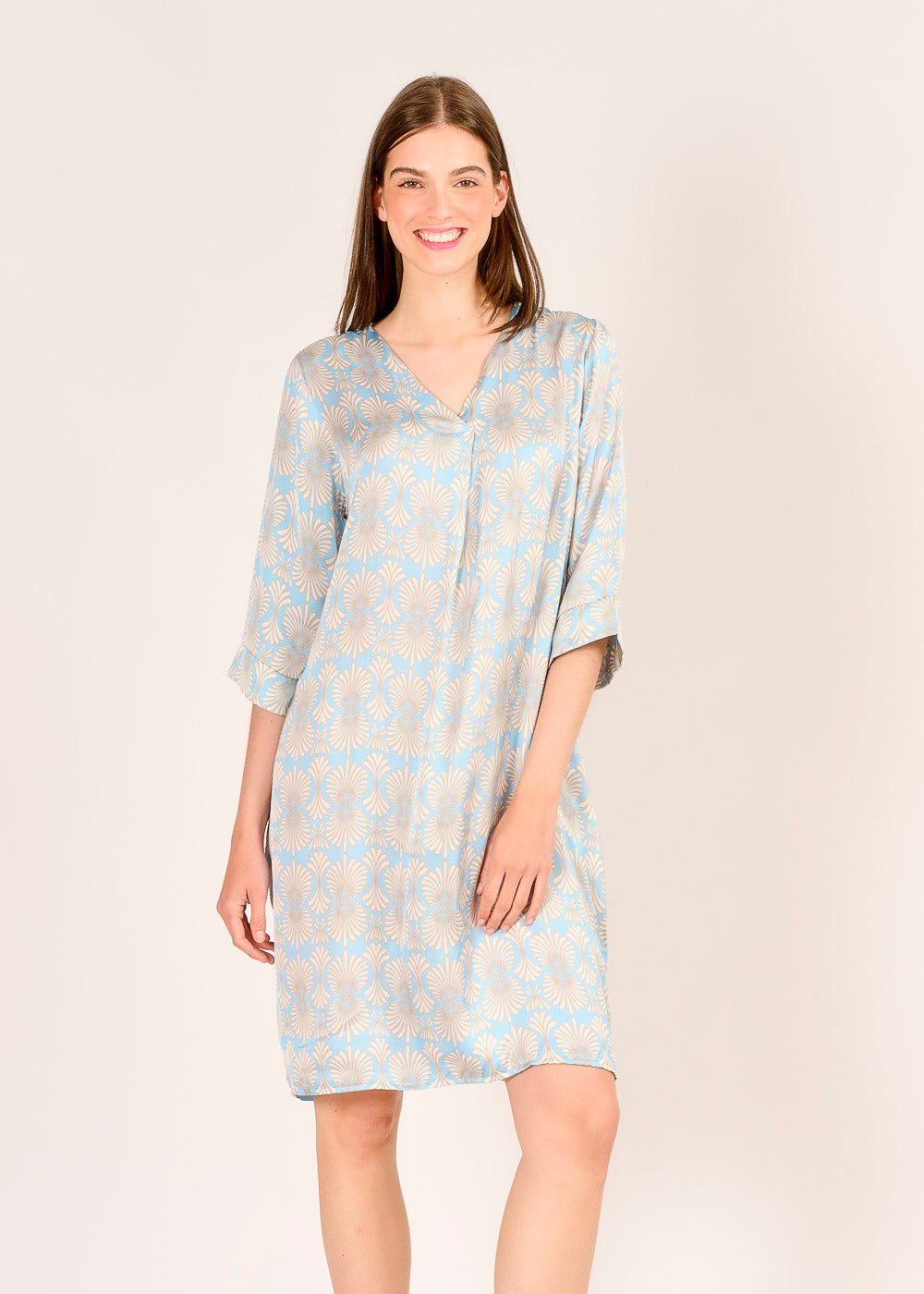 Dieses Druckkleid in Blau-Beige überzeugt mit seinem luftigen Schnitt und dem hochwertigen Stoff aus 100 % Viskose – angenehm weich und perfekt für warme Tage. Die 3/4-Ärmel und seitlichen Eingriffstaschen verleihen dem Kleid eine entspannte Lässigkeit. Ob mit Sneakern oder Sandalen – ein unkomplizierter Look mit Stil.