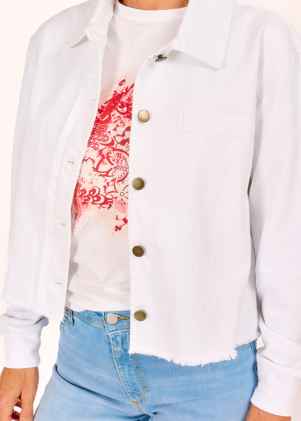 Diese elegante Kurzjacke in Weiß überzeugt mit einem modernen Materialmix, bei dem die Ärmel und die Rückseite aus weichem Sweatstoff bestehen, während die Vorderseite aus angenehmem Baumwollstoff gefertigt ist. Der Mix aus beiden Stoffen sorgt für ein gemütliches Tragegefühl und eine stilvolle Optik. Perfekt für den Alltag oder als modisches Teil für den Übergang – ein vielseitiger Begleiter für jede Gelegenheit.