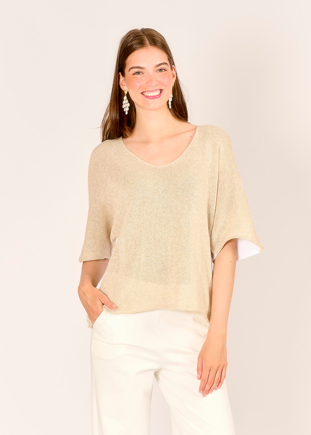 Dieser elegante zweifarbige Pullover verbindet zeitlose Eleganz mit modernem Chic: Die Vorderseite in zartem Beige strahlt natürliche Wärme aus, während die reine weiße Rückseite einen frischen, luftigen Kontrast bildet. Perfekt für einen mühelos stilvollen Look, der sich sowohl tagsüber als auch abends tragen lässt. Fühlen Sie sich wohl in diesem einzigartigen Design, das Ihre Garderobe gekonnt aufwertet.