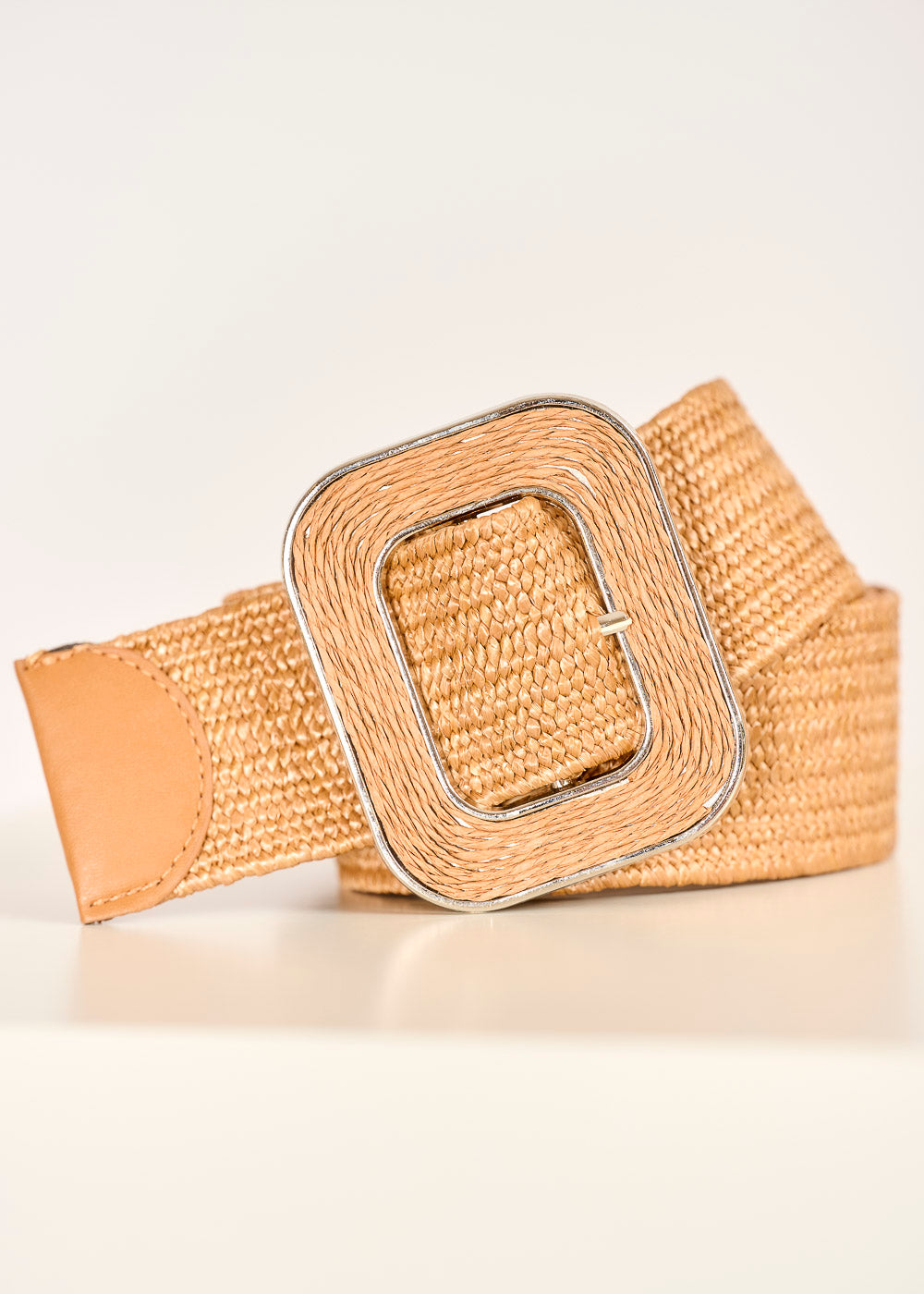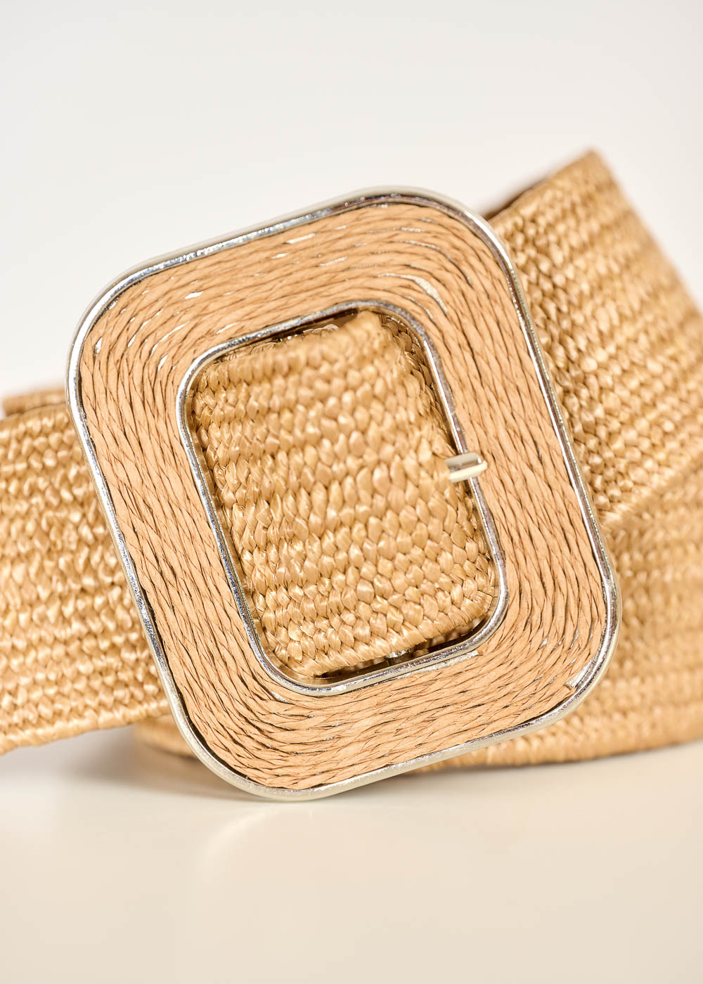 Ein Must-have für sommerliche Outfits: Dieser Bastgürtel mit seiner markanten Schnalle verleiht jedem Look eine natürliche Eleganz. Ideal, um Ihre Lieblingskleider und -hosen stilvoll zu ergänzen.