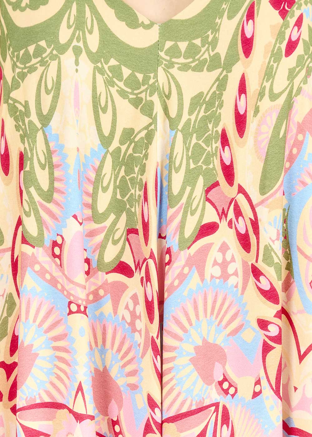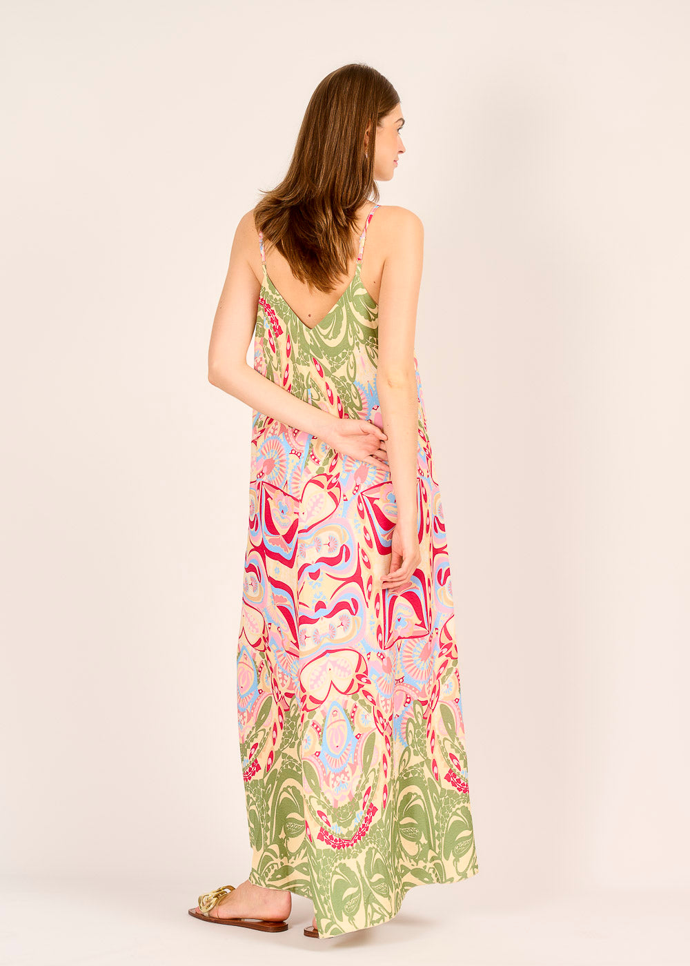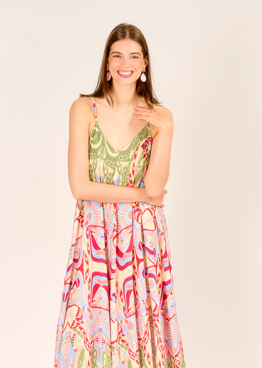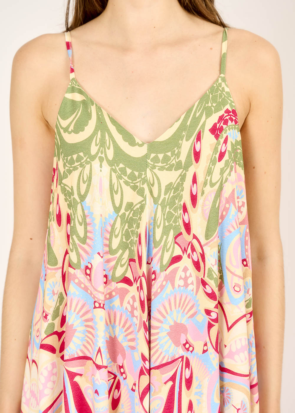 Tauchen Sie ein in ein Meer aus Farben mit diesem bezaubernden Spaghettiträgerkleid, das mit seinem lebhaften, kaleidoskopartigen Muster begeistert. Der fließende Schnitt und die zarten Träger sorgen für eine luftige Silhouette und höchsten Tragekomfort an warmen Tagen. Ein absolutes Statement-Piece, das Sommerlaune versprüht und Sie bei jedem Anlass zum Blickfang macht.