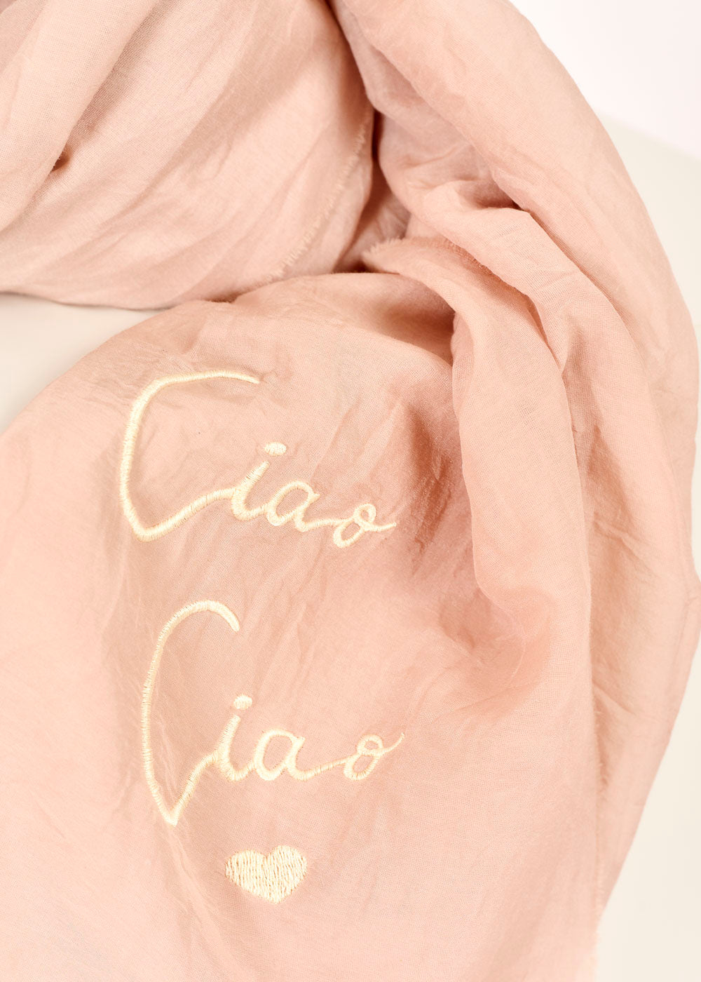 Dieses Tuch mit der liebevollen Stickerei "Ciao Ciao" ist ein charmantes Accessoire mit italienischem Flair. Der leichte Stoff und das verspielte Detail machen es zum perfekten Begleiter für frische, modische Looks. Ideal für deinen nächsten Stadtbummel oder einen entspannten Café-Besuch.
