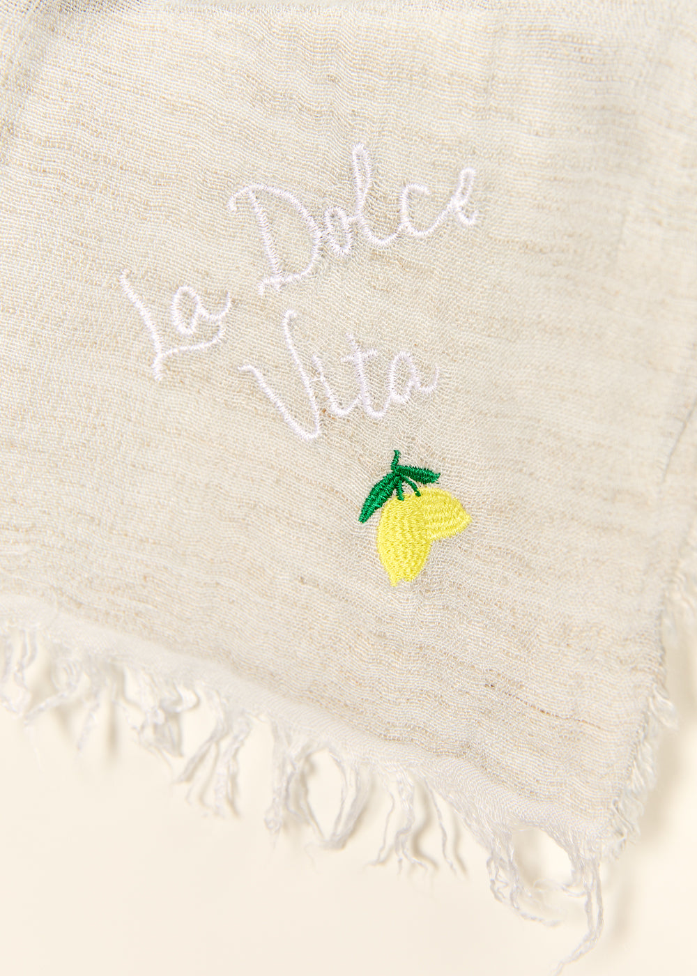 „La Dolce Vita“ zum Umlegen – dieses Tuch verleiht deinem Look mediterranes Flair mit einem Augenzwinkern. Die zarte Stickerei mit Zitronenmotiv und lässigen Fransen macht es zum charmanten Hingucker, der Urlaubsstimmung versprüht. Aus weichem, leichtem Stoff gefertigt, begleitet es dich stilvoll durch laue Sommerabende oder als lässiges Accessoire im Alltag.