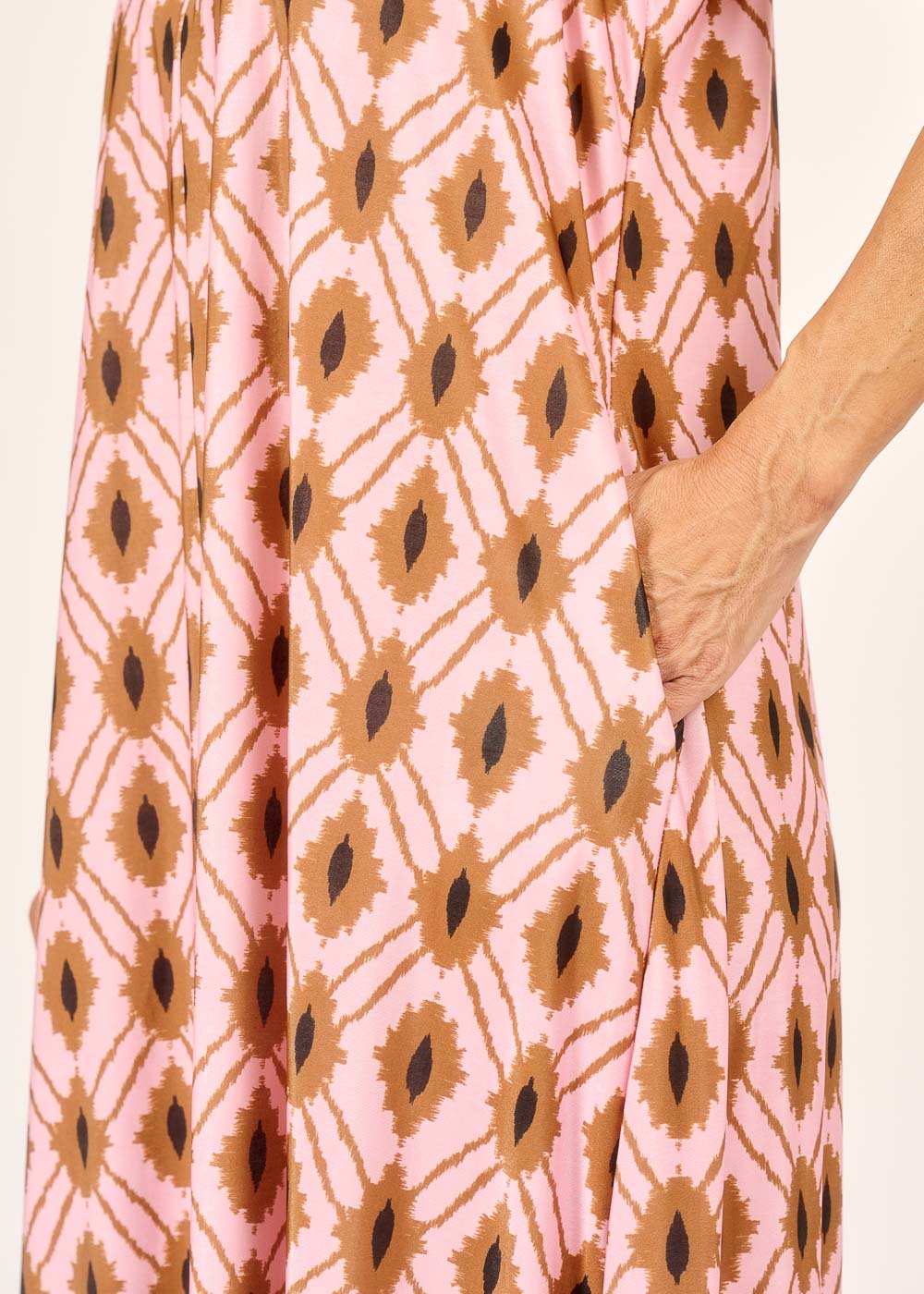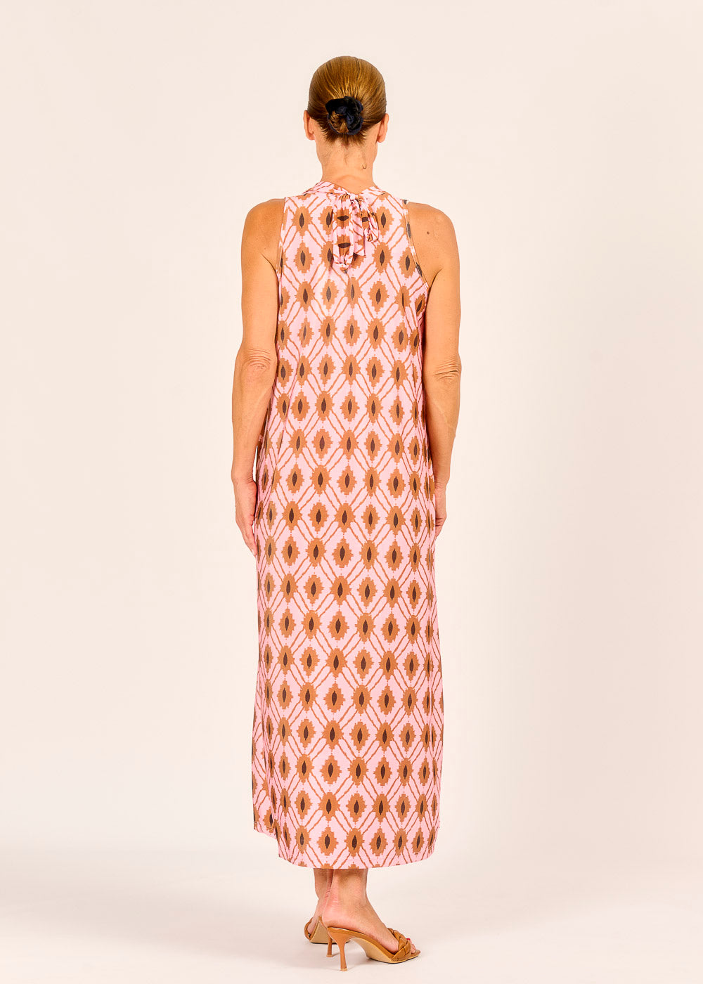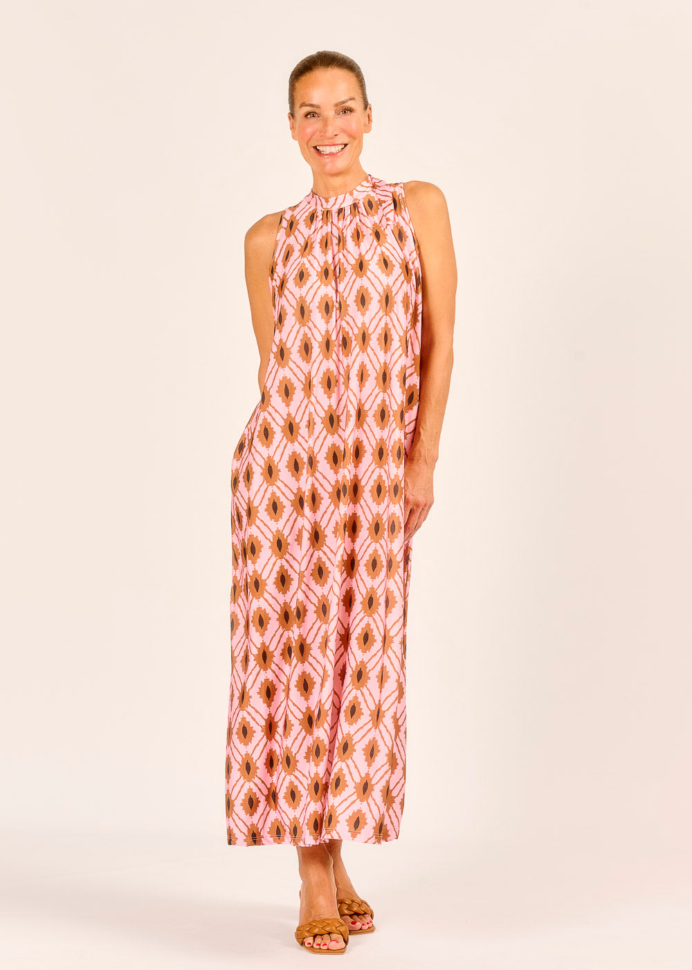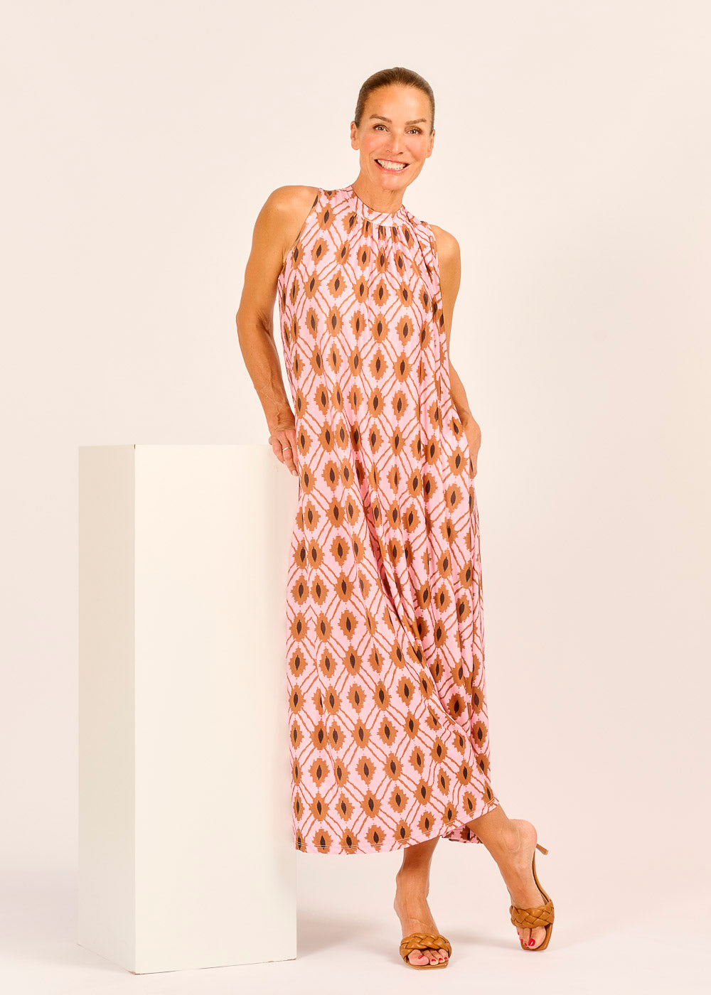 Dieses elegante Neckholderkleid begeistert mit seinem einzigartigen Muster, das sommerliche Leichtigkeit und eine Prise Exotik vereint. Der fließende Stoff schmiegt sich sanft an die Silhouette und sorgt für maximalen Komfort, ideal für Reisen oder entspannte Tage. Mit seinem schmeichelhaften Schnitt und dem lebendigen Design ist dieses Kleid ein absolutes Statement-Piece, das Sie stilvoll durch jede Saison begleitet.