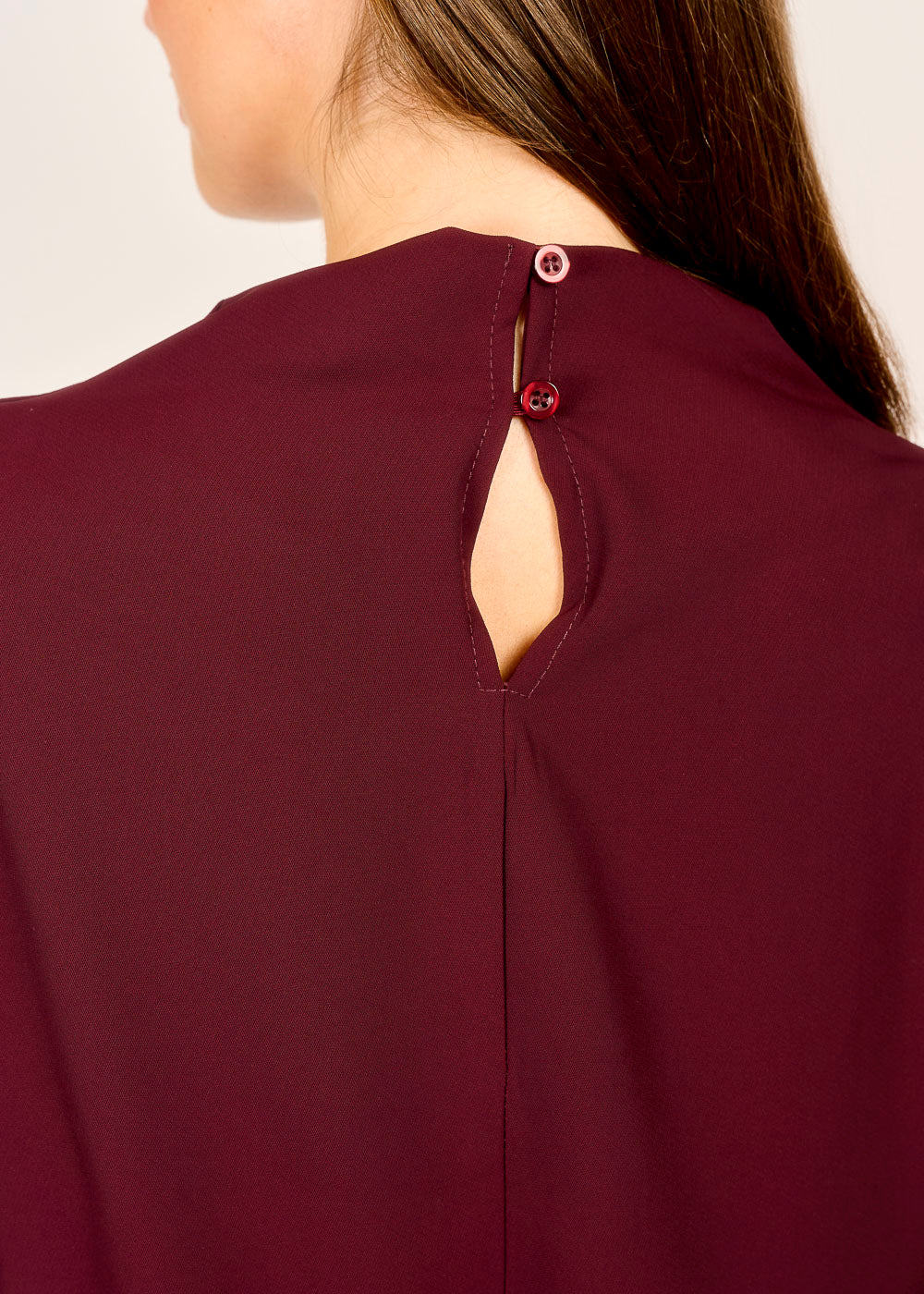 Eleganz trifft auf Raffinesse – dieses edle Blusenshirt in tiefem Vino ist ein stilvoller Begleiter für viele Anlässe. Hinten mit zwei dezenten Knöpfen veredelt und seitlichen Schlitzen versehen, bringt es Leichtigkeit und feine Details in dein Outfit. Ein feminines Must-have, das mühelos Chic und Komfort vereint.
