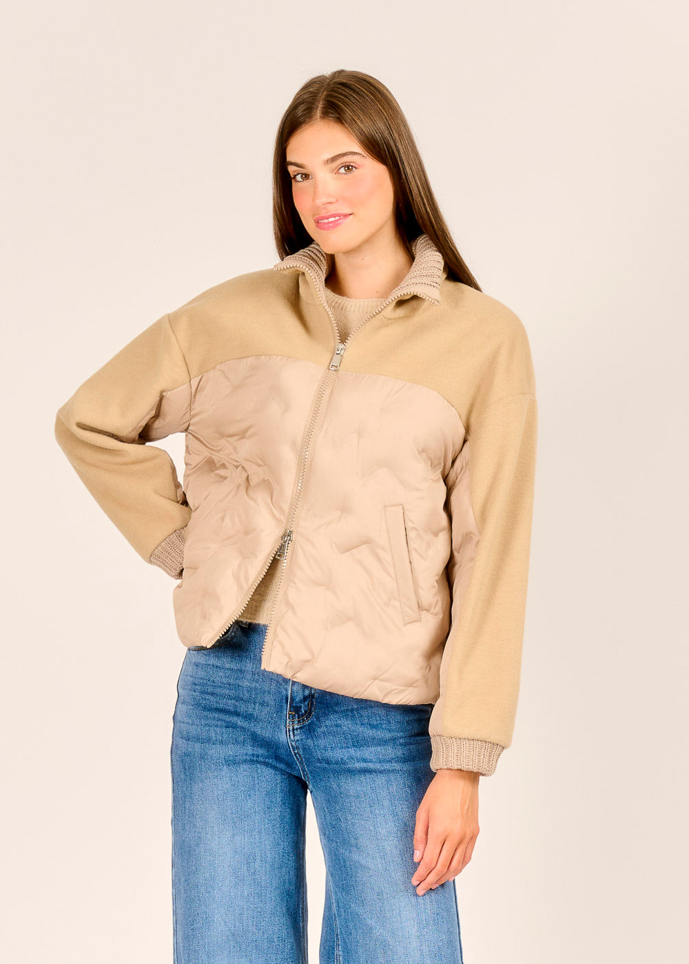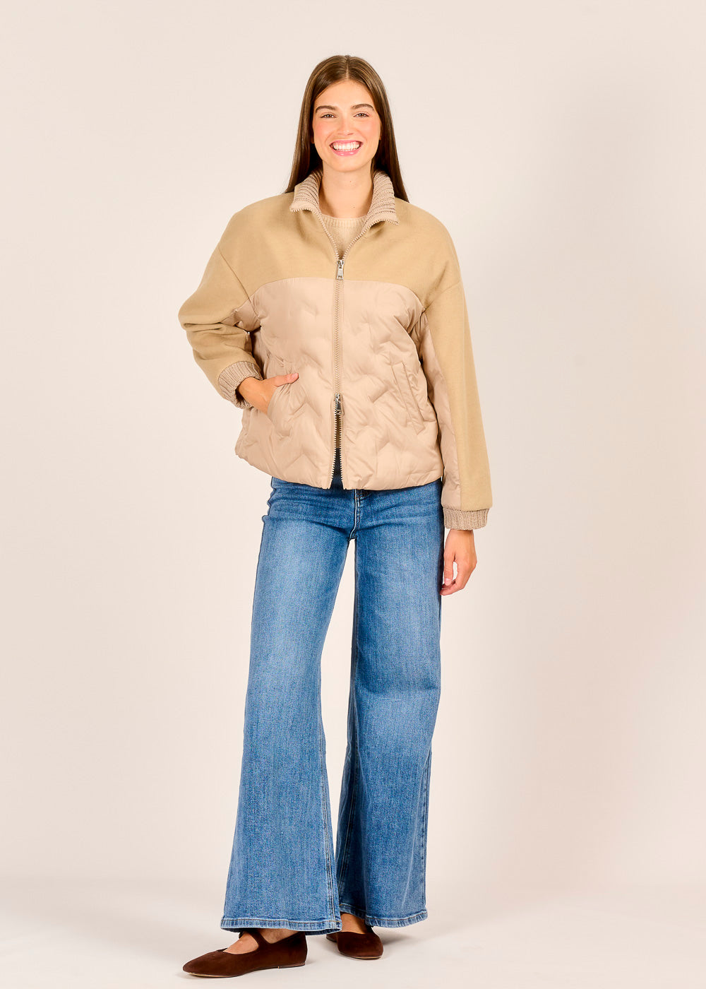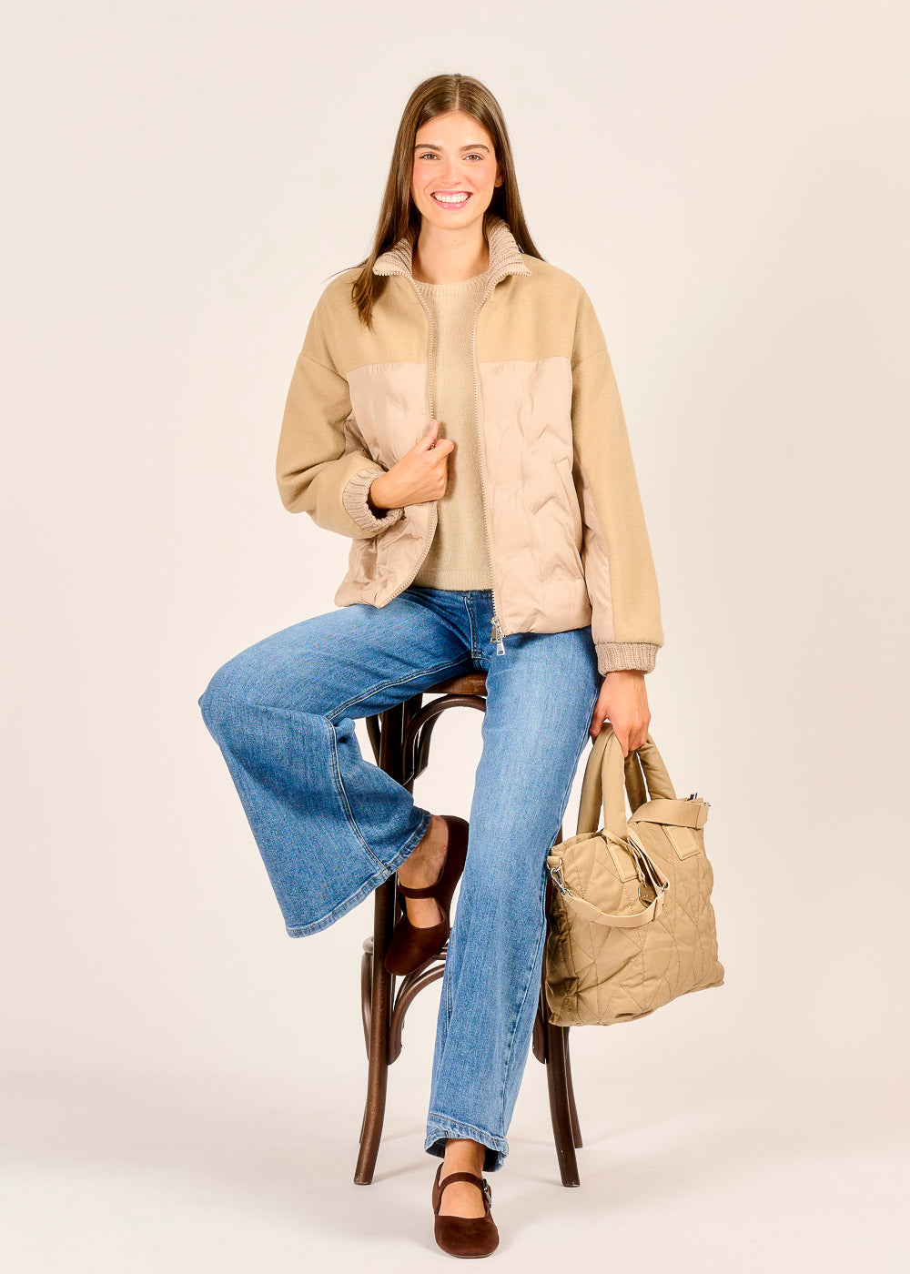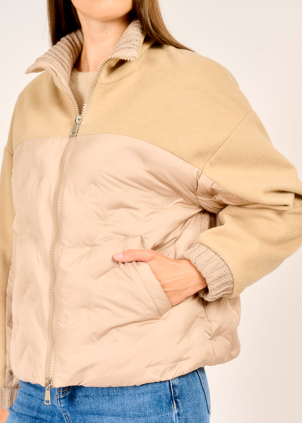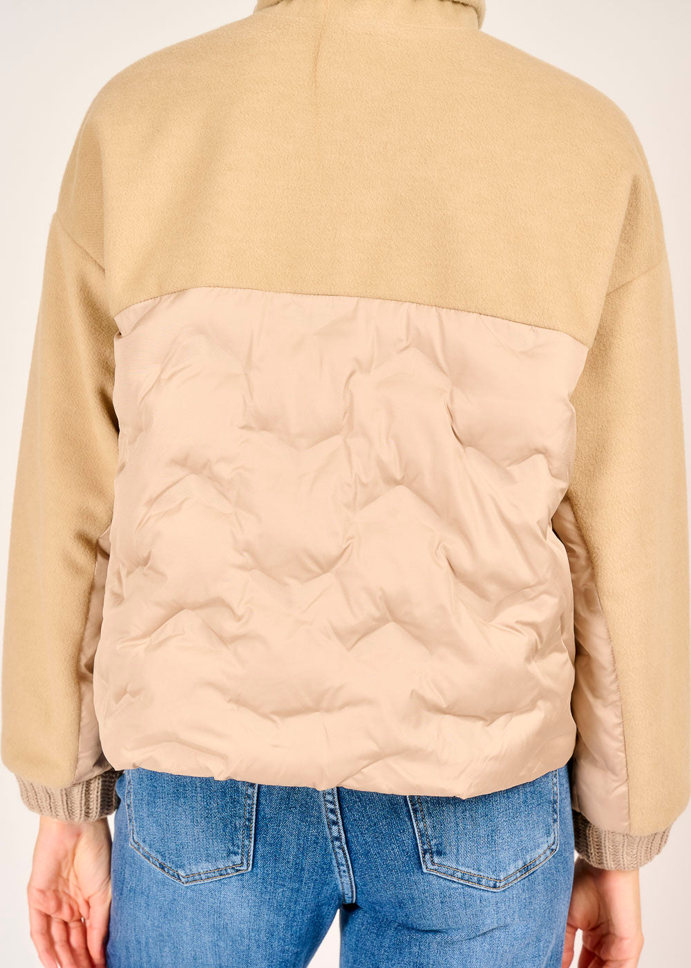 Mit ihrem außergewöhnlichen Materialmix ist diese Jacke in einem sanften Beigeton ein modisches Highlight für die Übergangszeit. Die Kombination aus kuscheligem Teddy-Stoff und sportlich gesteppten Partien schafft einen spannenden Kontrast. Ein vielseitiges und trendiges Kleidungsstück, das Ihrem Look eine besondere und zugleich lässige Note verleiht.