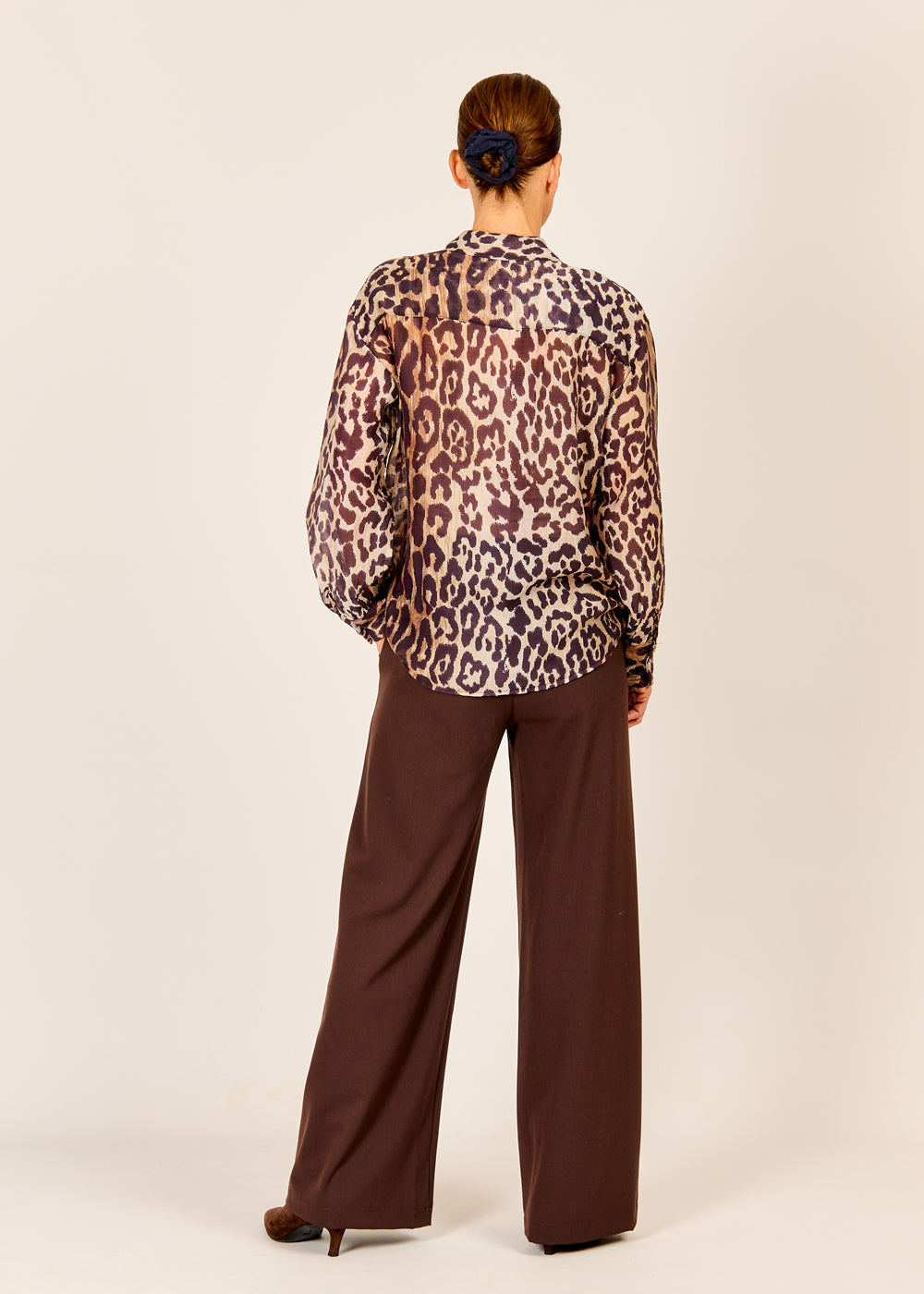 Diese exquisite Animal-Print-Bluse interpretiert das klassische Leopardenmuster neu mit einem luxuriösen, fließenden Material. Die warmen Braun- und Taupetöne des Prints verleihen der Bluse eine raffinierte Tiefe, die perfekt für elegante Anlässe ist. Mit ihrem zeitlosen Schnitt und dem Kragen ist sie sowohl schick für das Büro als auch ein glamouröses Statement für abendliche Events. Kombinieren Sie sie zu schlichten Hosen oder Röcken, um den Fokus auf dieses unwiderstehliche Trendstück zu lenken.