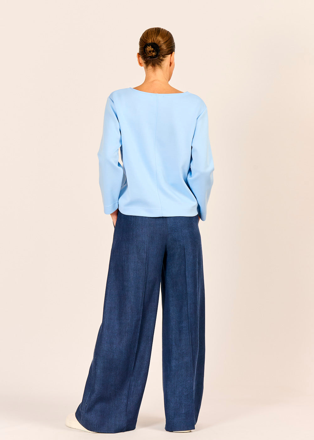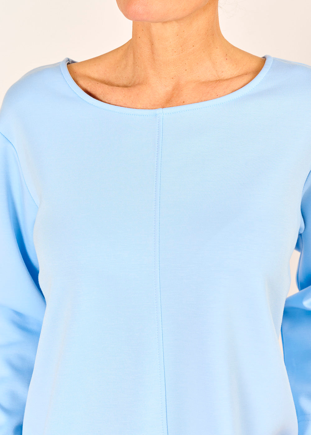 Dieses celestefarbene Shirt besticht durch seine schlichte Eleganz und den modernen, klaren Schnitt. Ein besonderes Detail ist die feine, vertikale Naht, die sich mittig über das Oberteil zieht und ihm eine dezente Struktur verleiht. Dank des hochwertigen Materials und des weiten Rundhalsausschnitts ist es ein vielseitiges, bequemes Basic – ideal für Layering oder einen cleanen, modernen Look.