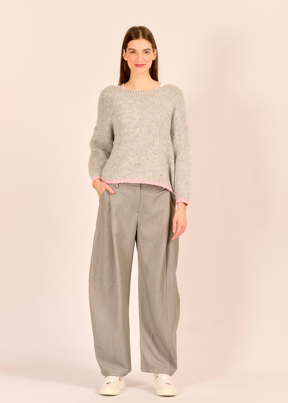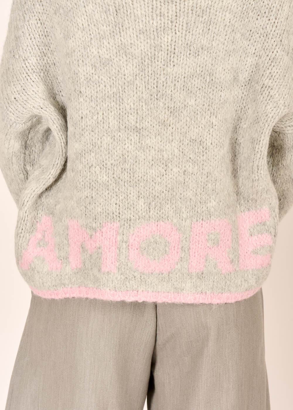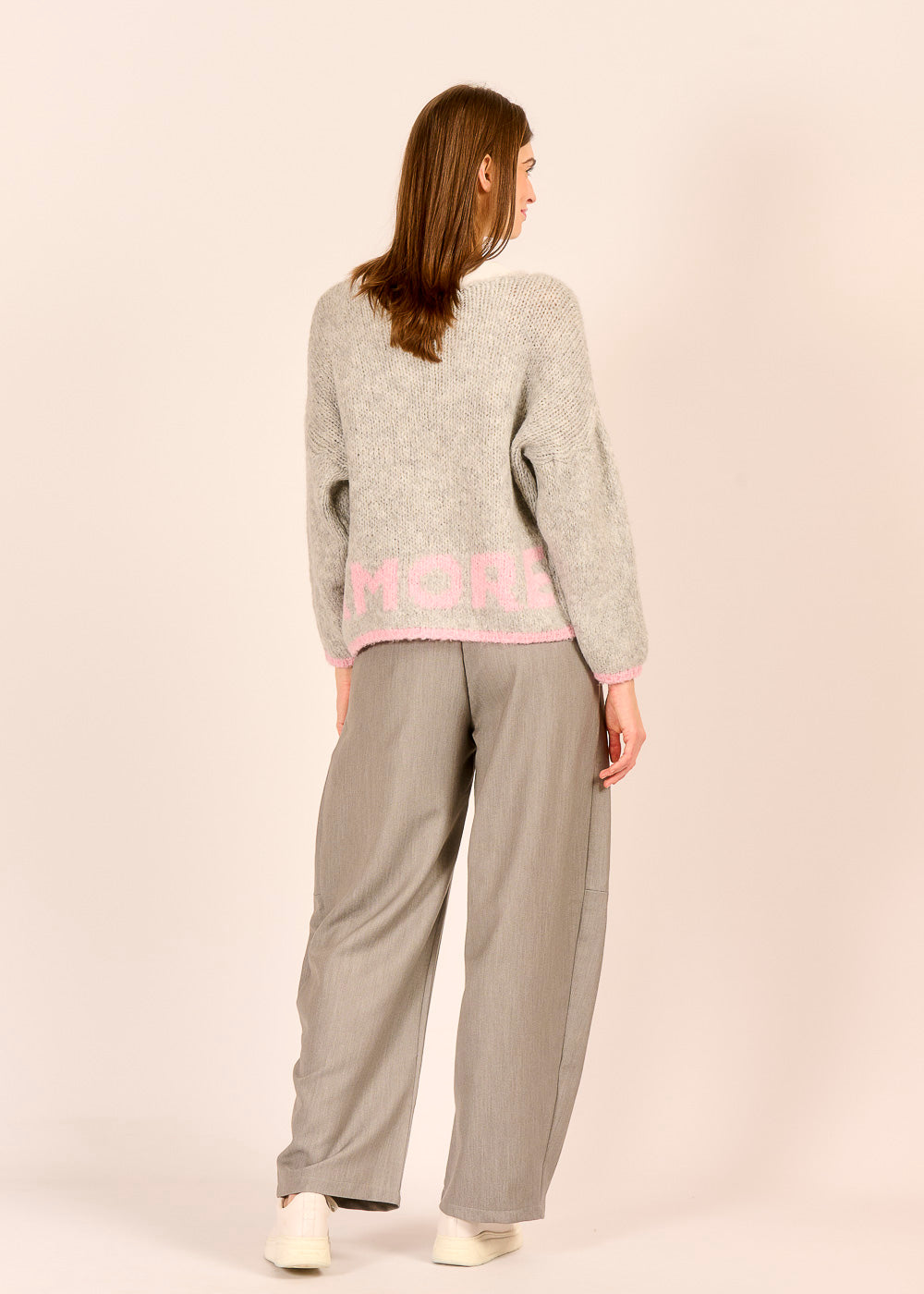Charmanter Blickfang: Der graue Strickpullover überrascht mit einem dezenten Schriftzug. Kombiniert mit einer Ballonhose entsteht ein lässiger und zugleich stilbewusster Look für die Feiertage mit den Liebsten.