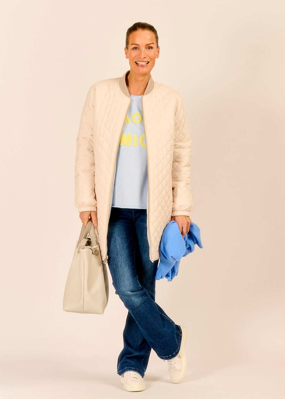Der vielseitige Wendebomberino sorgt durch den langen Schnitt für maximalen Komfort in der kühlen Übergangszeit. Durch das clevere Wendekonzept hast du zwei Looks in einem: Die hellblaue Seite wirkt ruhig und elegant, während die gesteppte Seite deinem Look einen edlen Akzent verleiht.