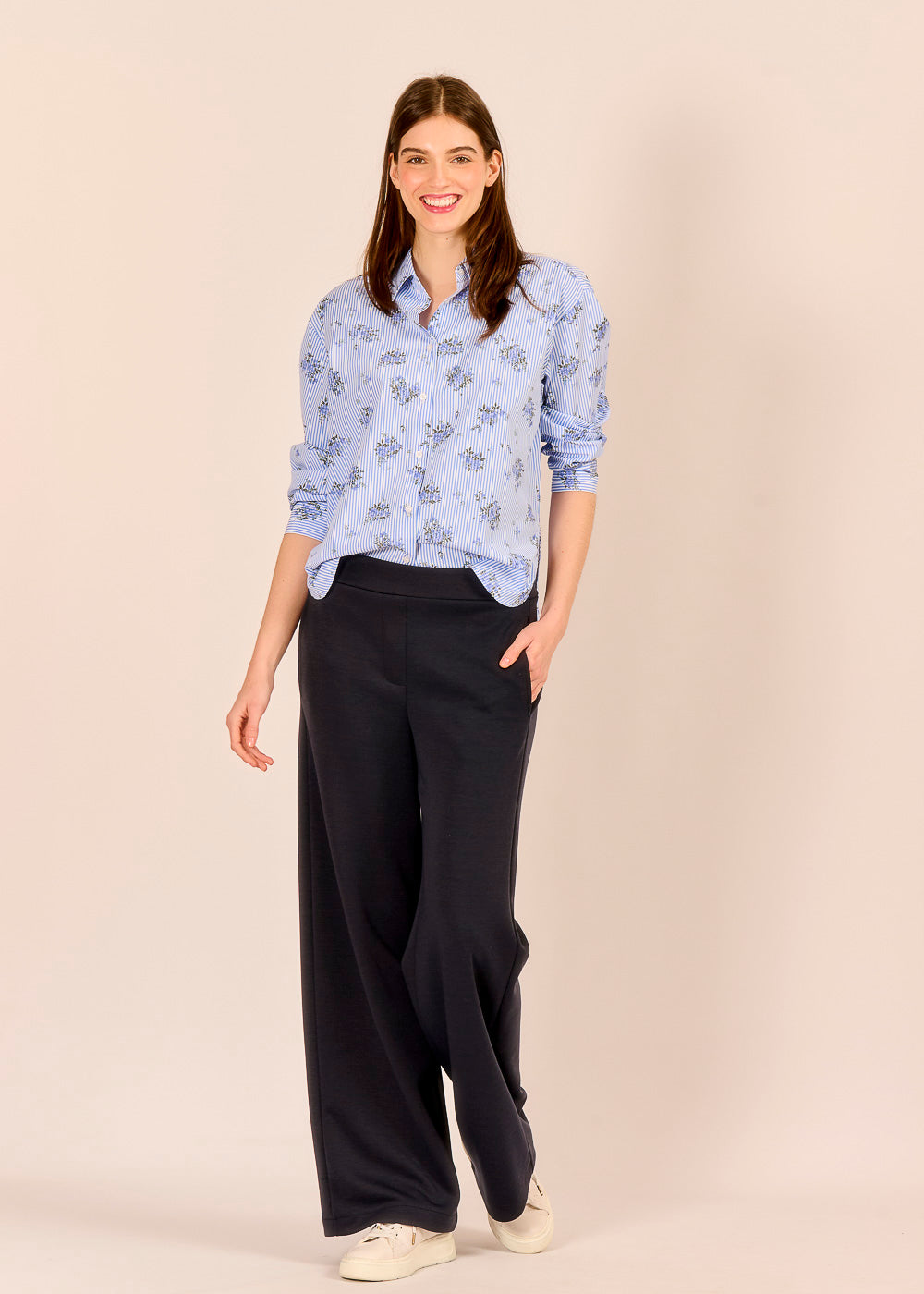 Die dunkelblaue Pantalone strahlt selbstverständliche Eleganz aus. Der fließende Schnitt schenkt dir Bewegungsfreiheit und formt gleichzeitig eine feminine Silhouette. Ob elegant mit einer Bluse oder lässig mit einem Bomberino kombiniert – diese Pantalone ist perfekt für den Alltag.
